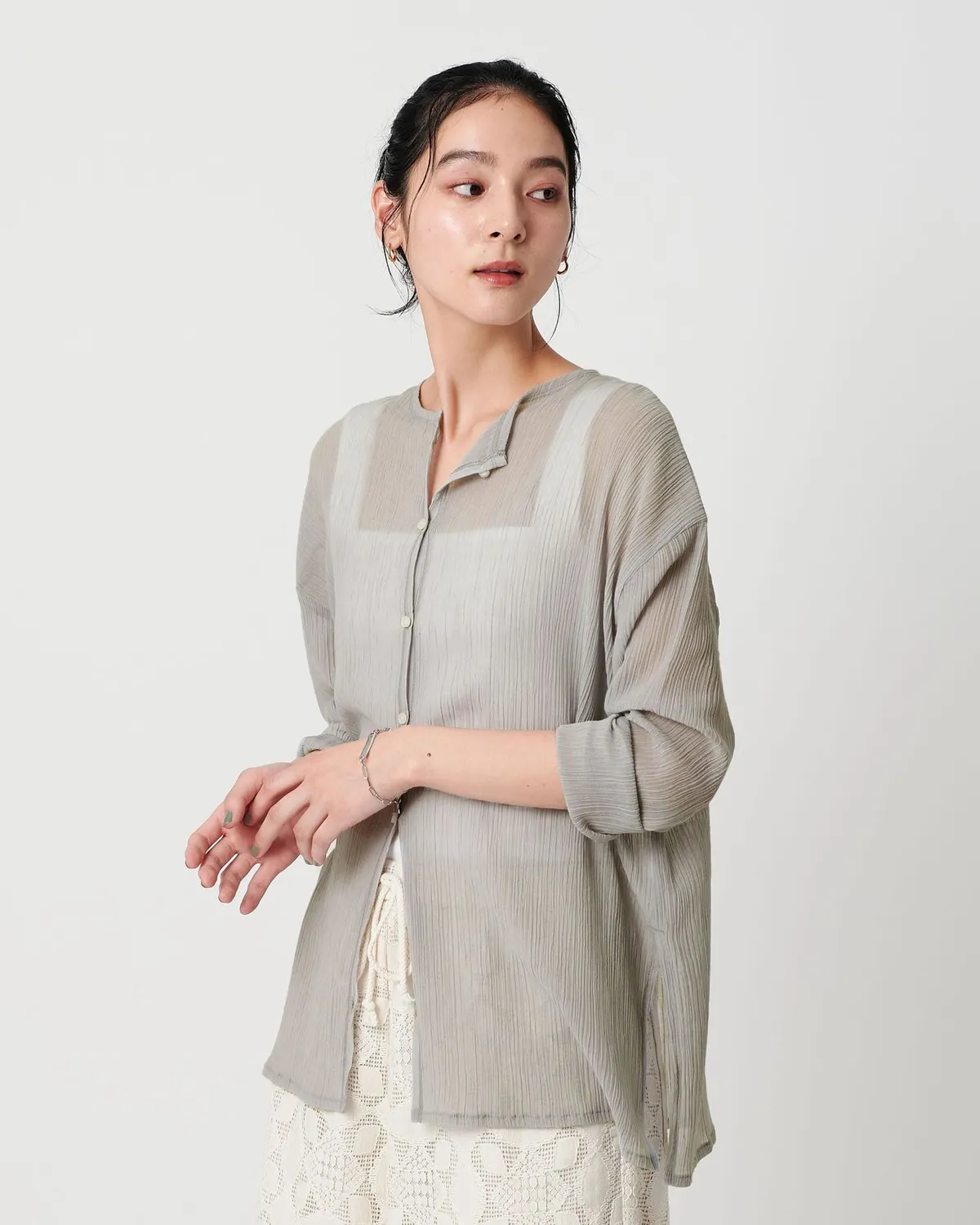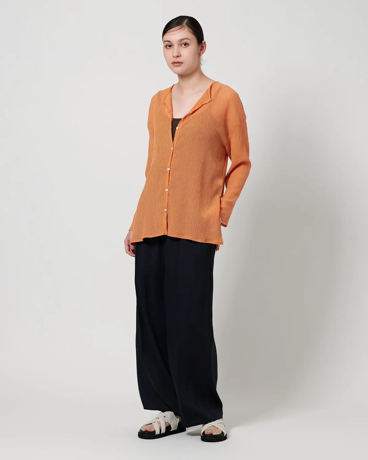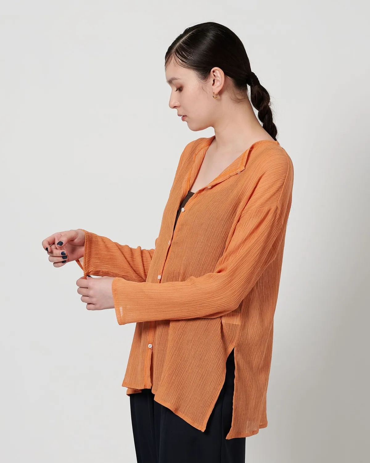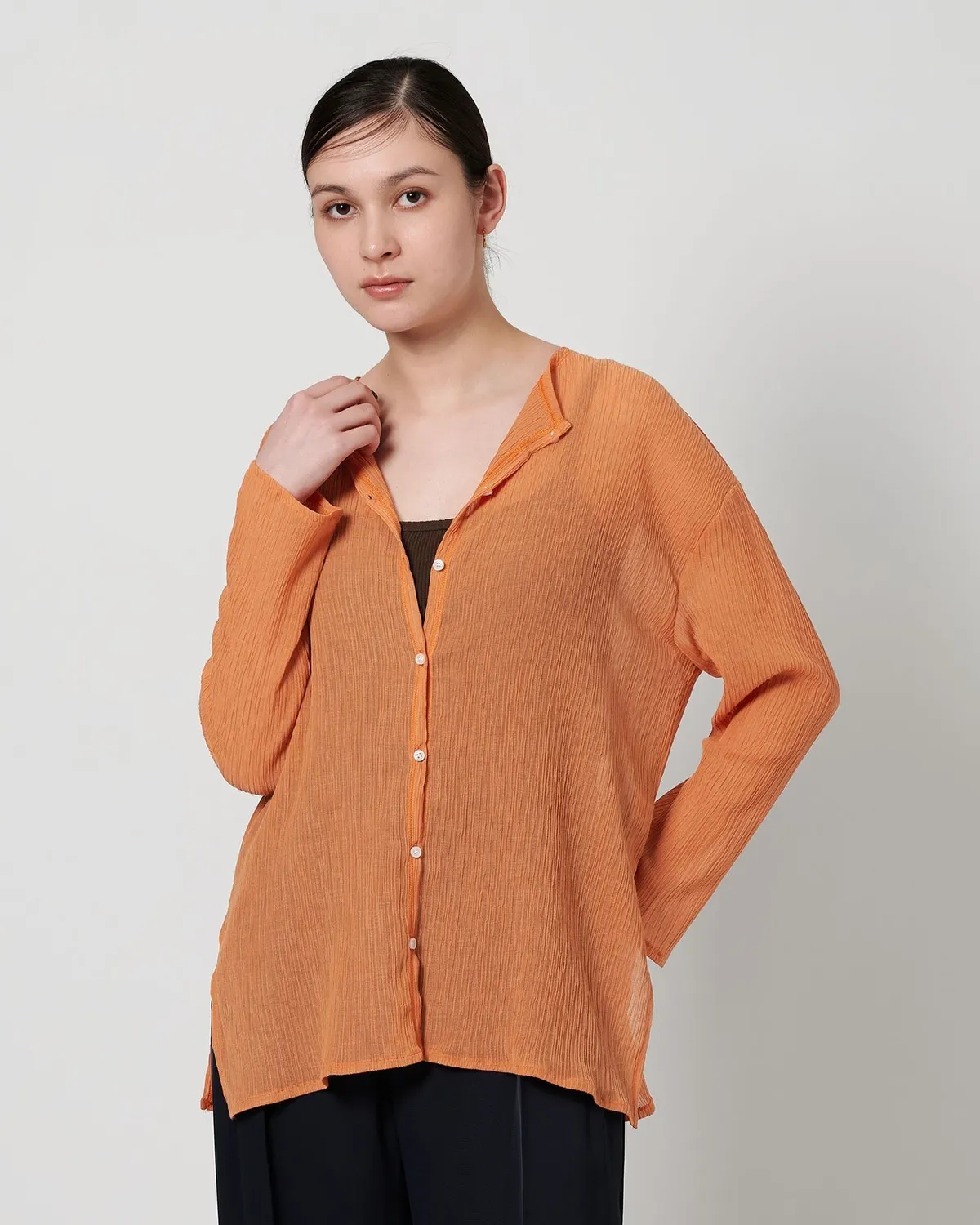 夏季日常必備單品透膚縐布開領襯衫採用有紋理的柳條布料製成手感光滑乾爽,在家手洗也很方便輕盈觸感非常適合炎熱季節單穿或是作為罩衫都可以側邊的深開衩增添了微妙的韻味共四色 / 日本製材質:69%滌綸,31%棉 此商品為預購商品 到貨時間需等待10~21個工作天 不含假日及國定假日 ⚠️急件處理需自行負擔國際運費