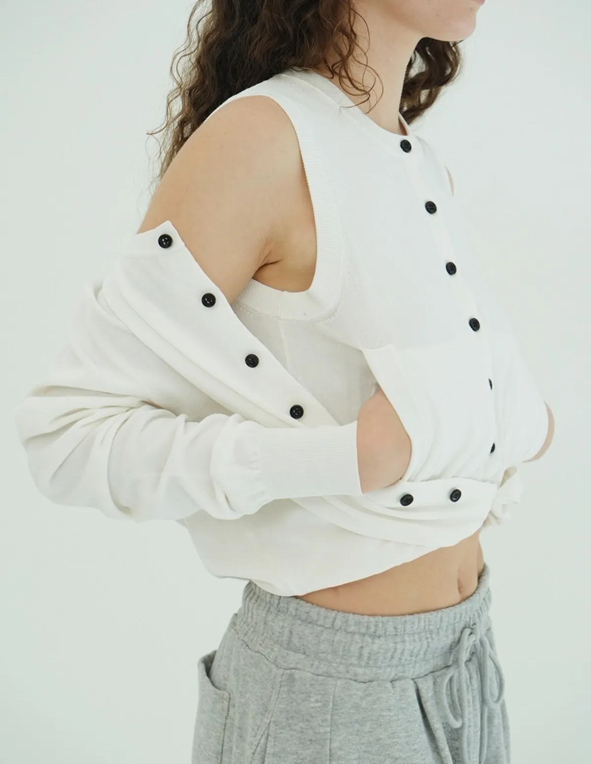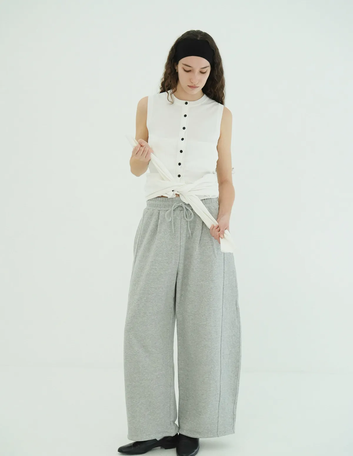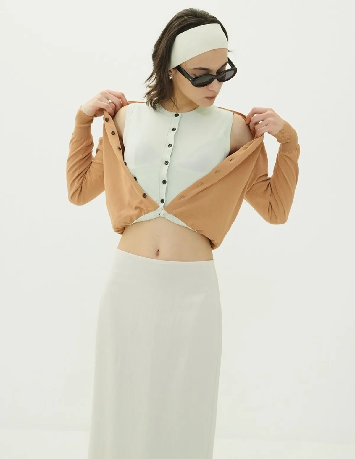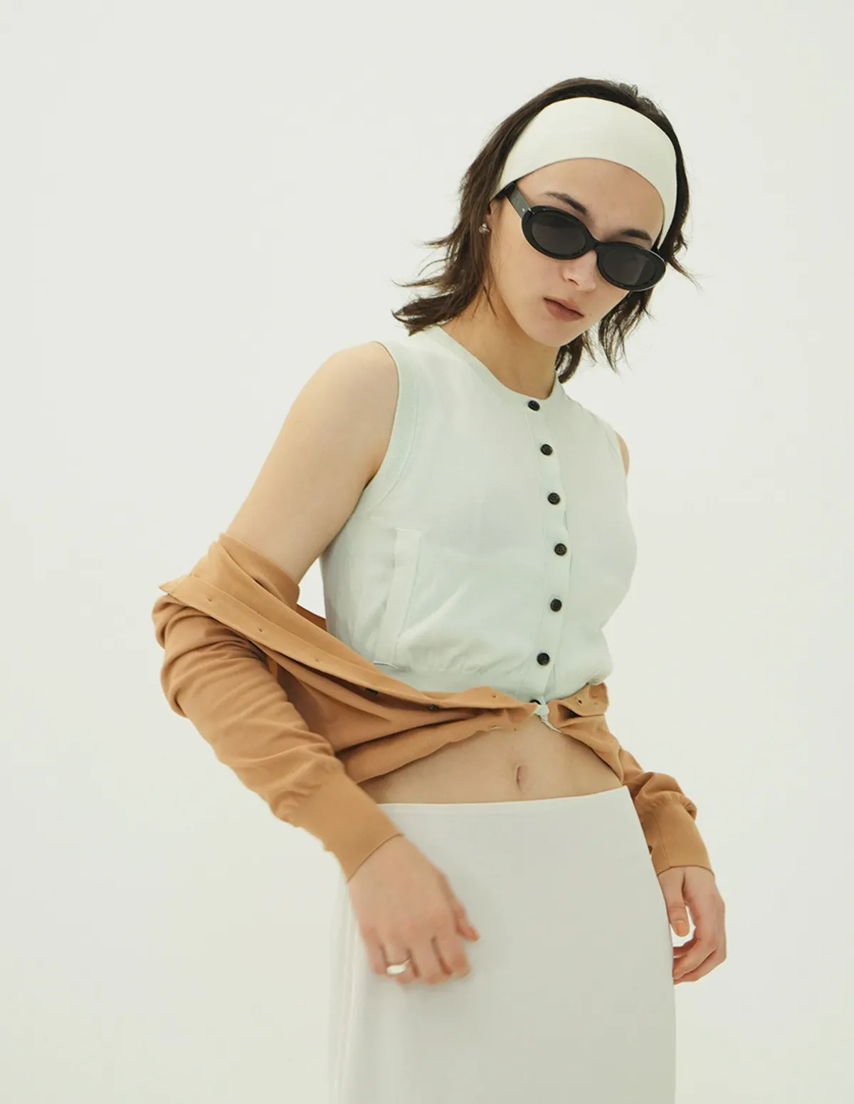 將針織外套繫在腰間,打造出無袖背心造型
