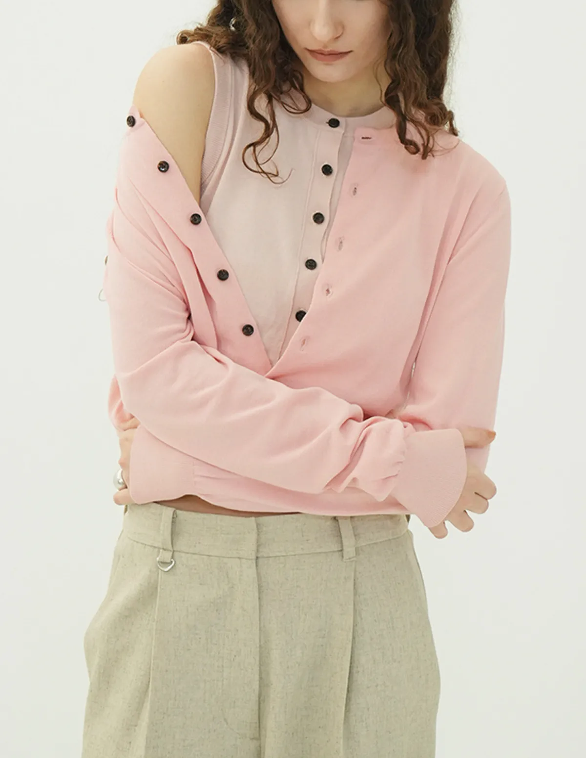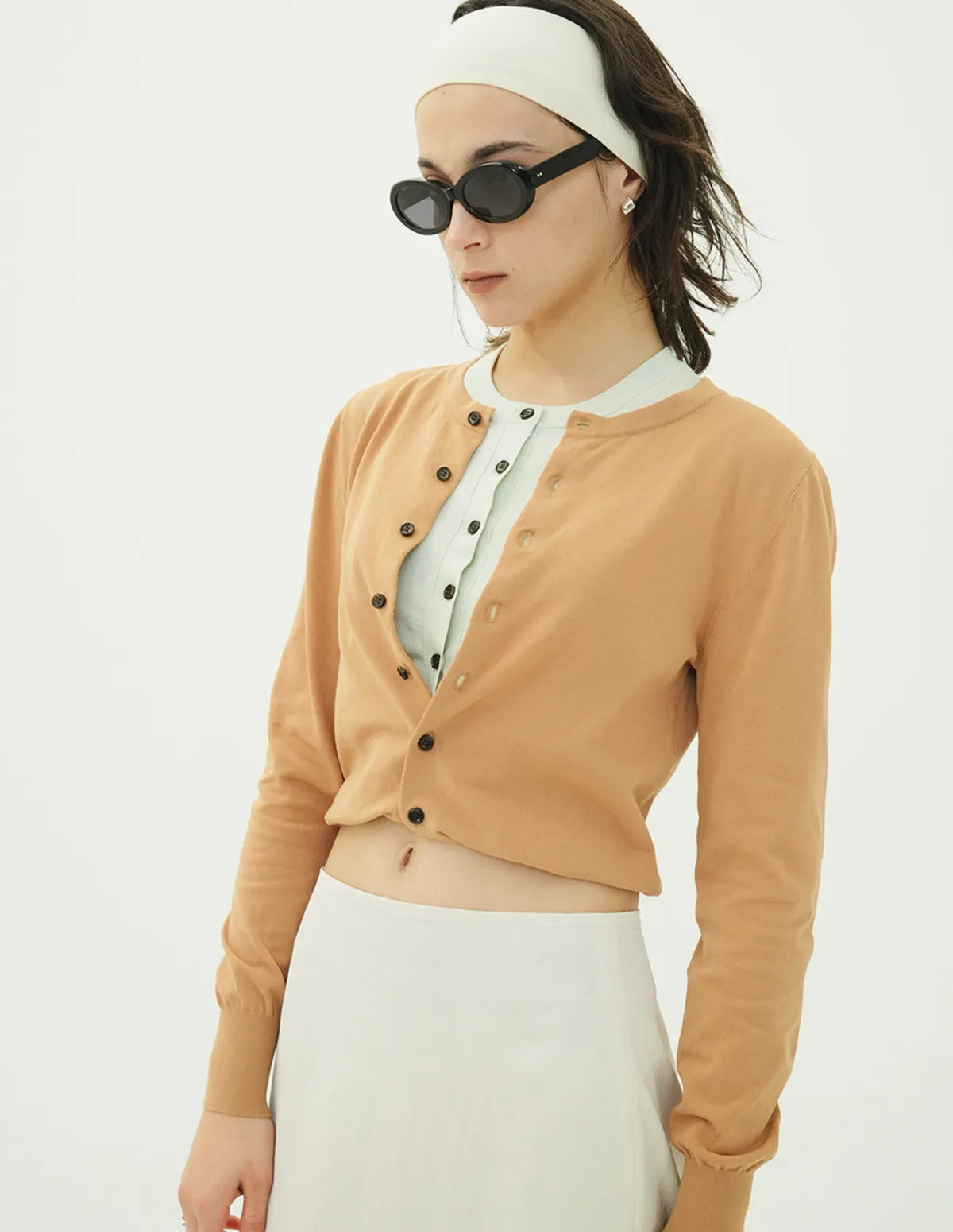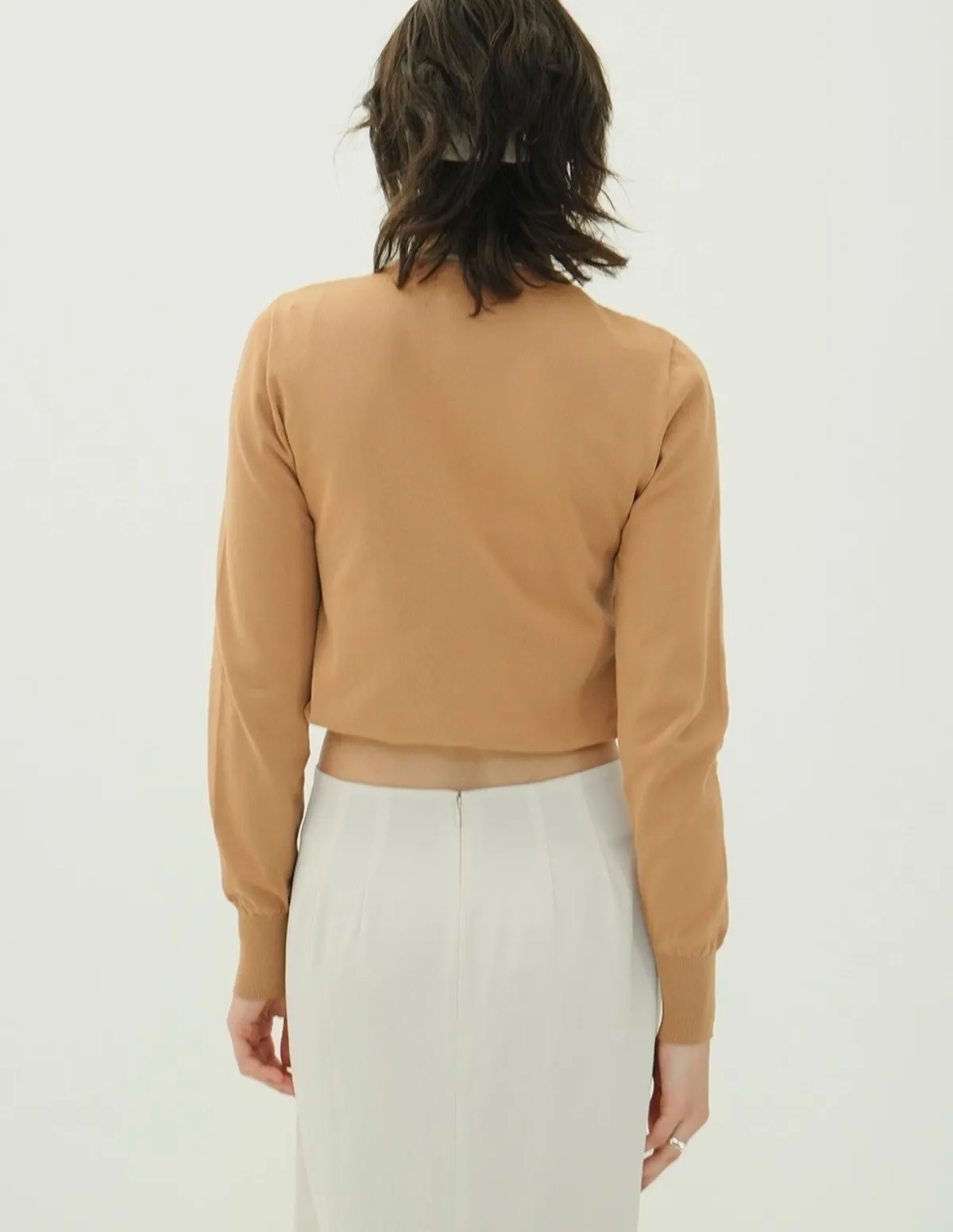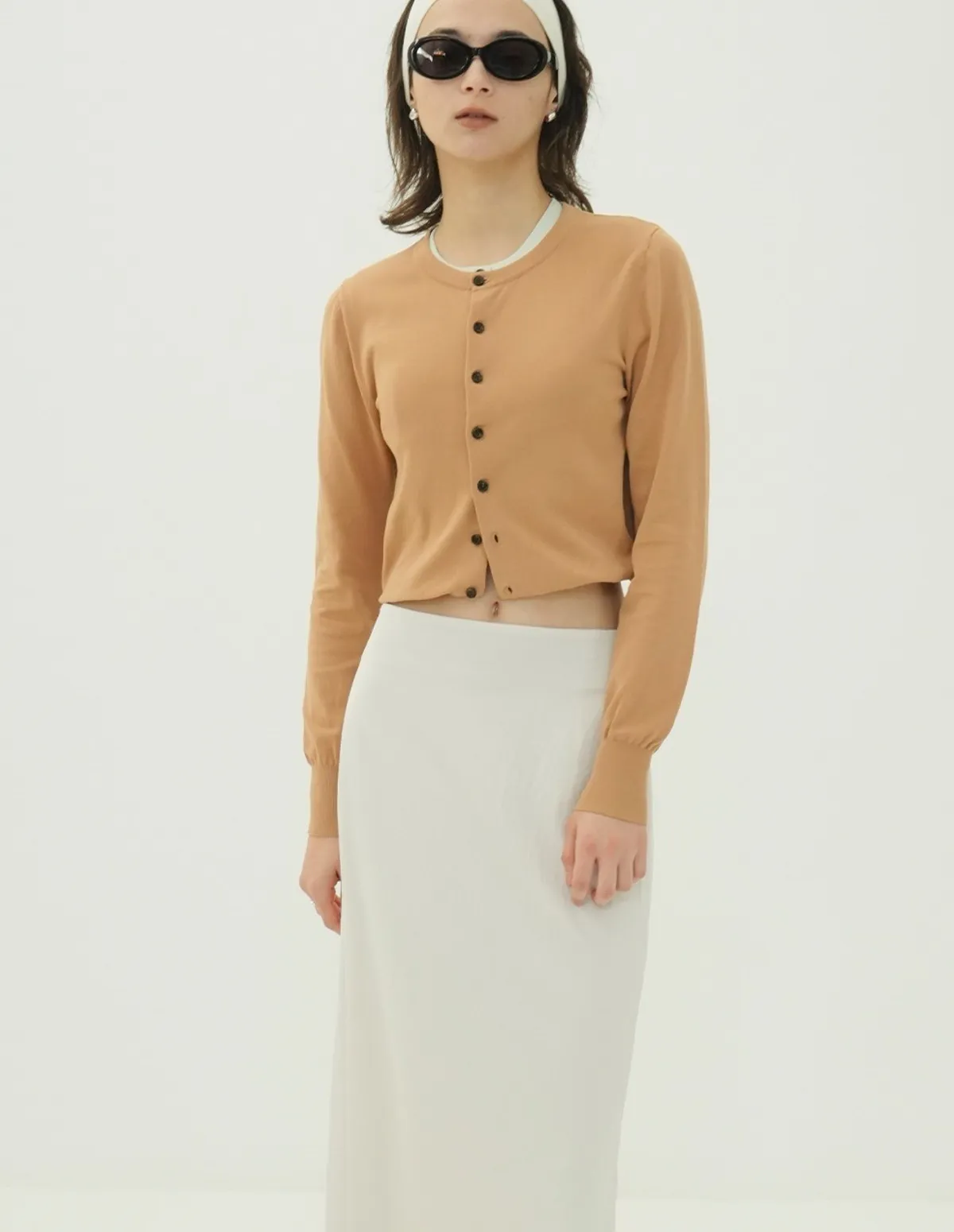 將針織外套繫在腰間,打造出無袖背心造型