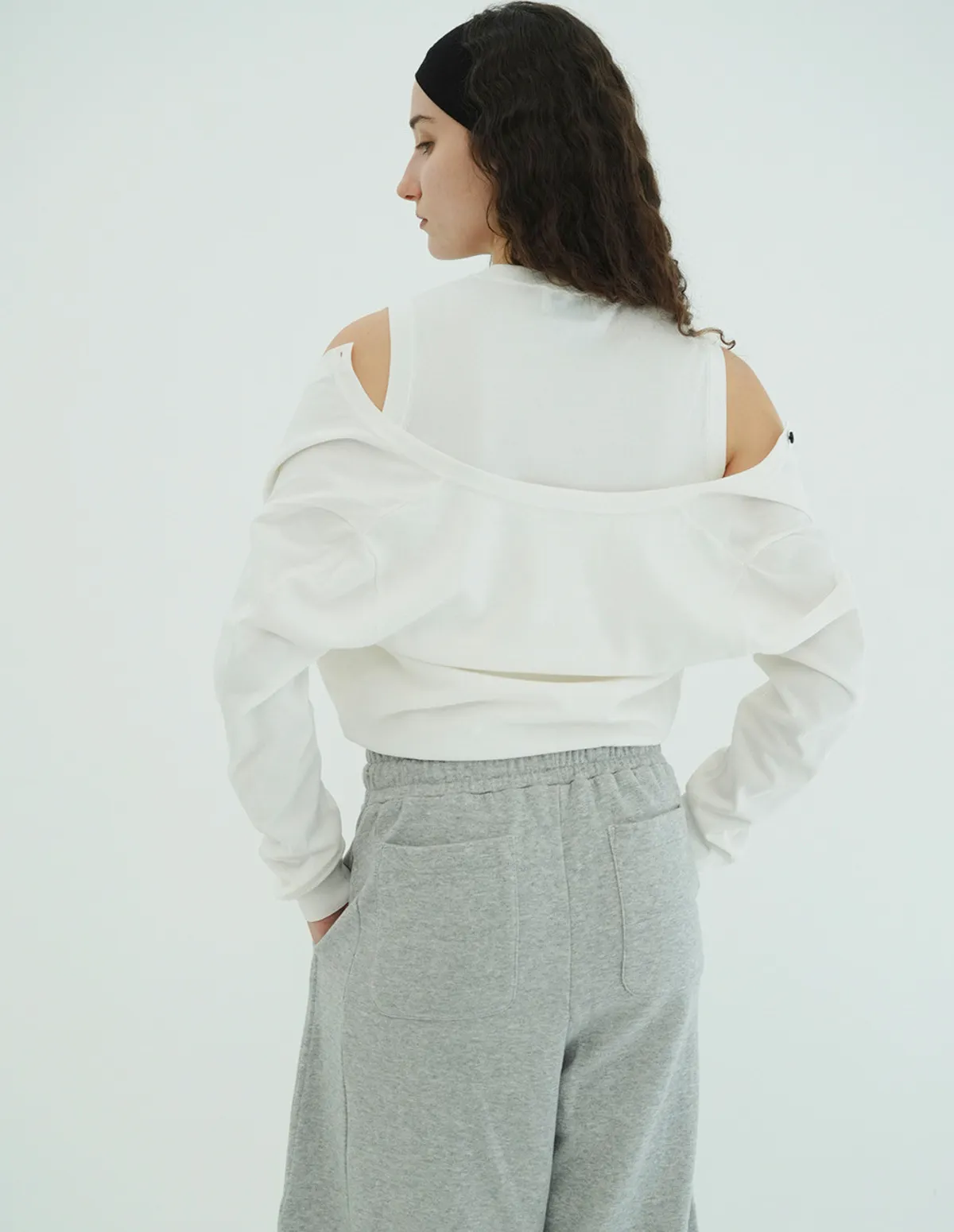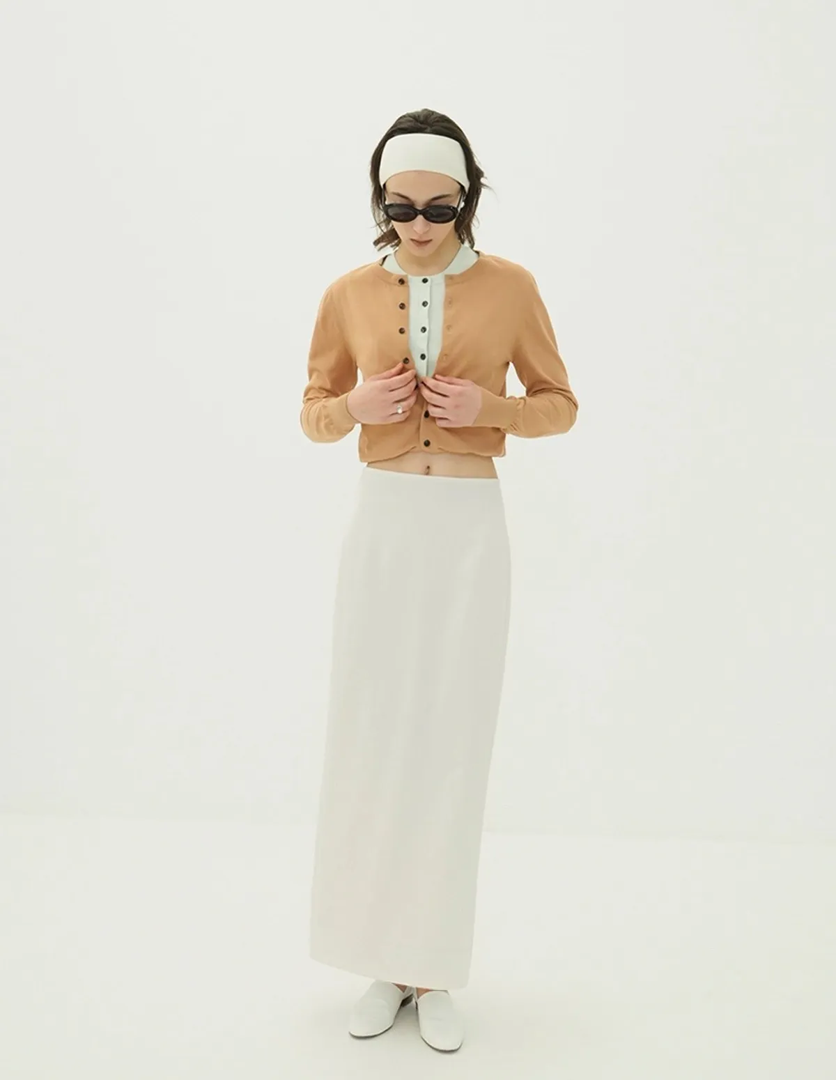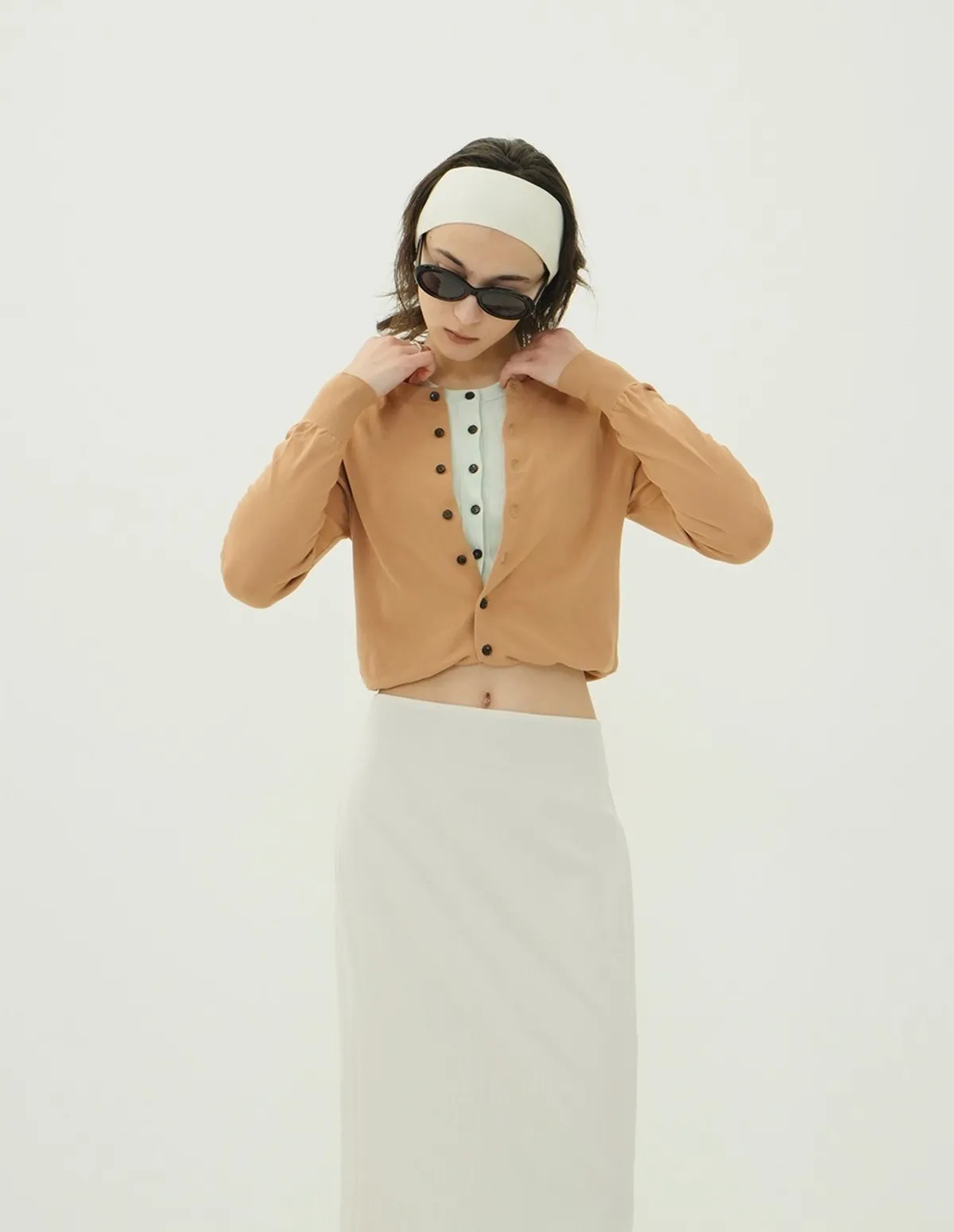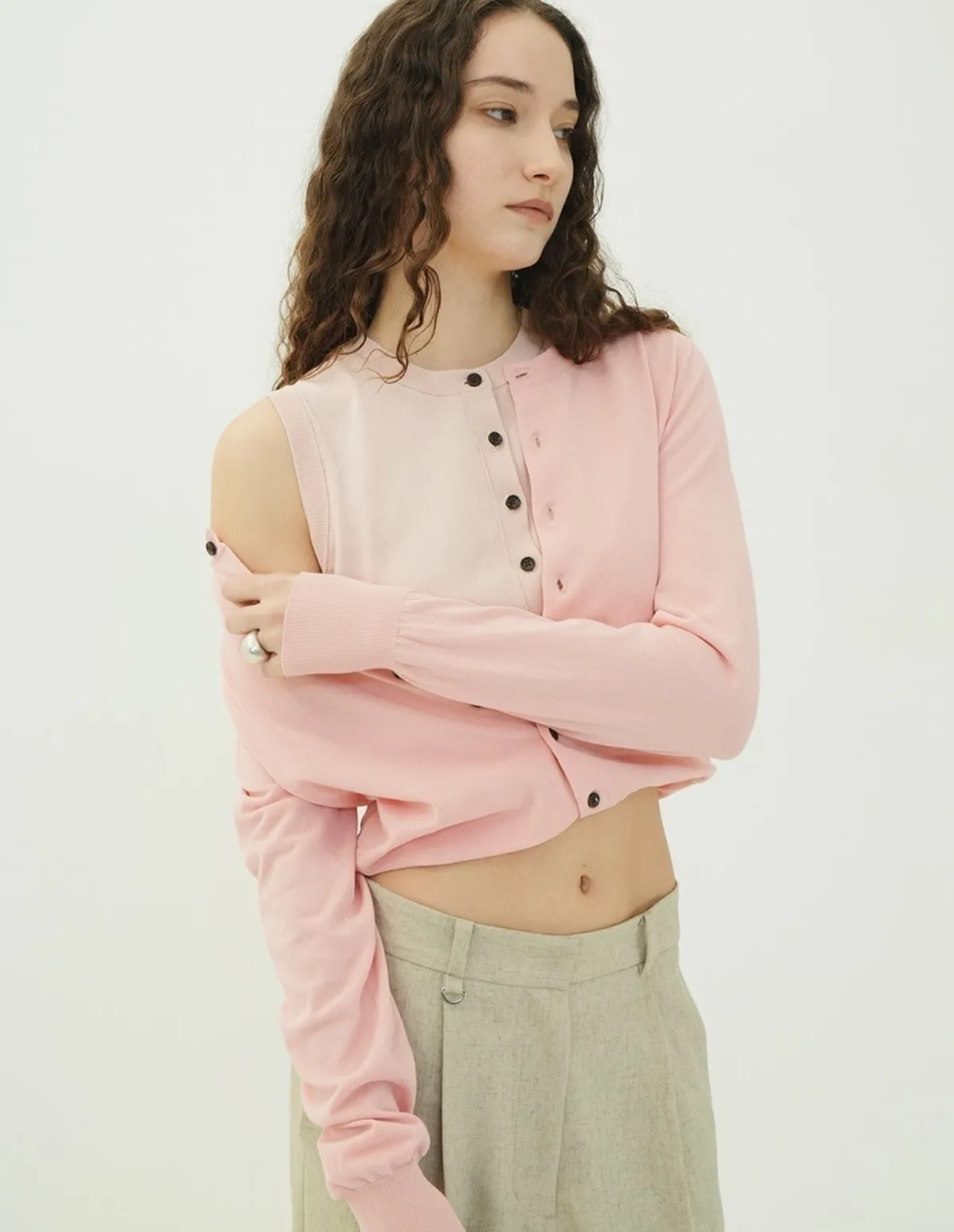 將針織外套繫在腰間,打造出無袖背心造型