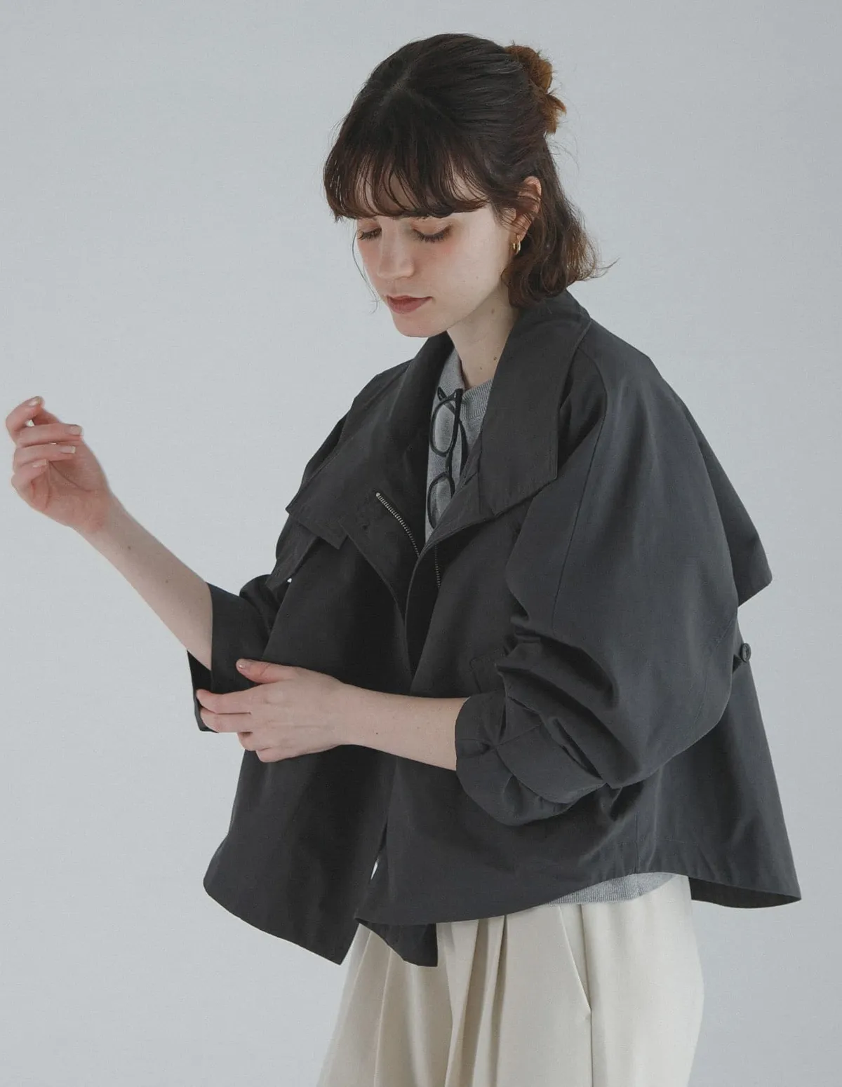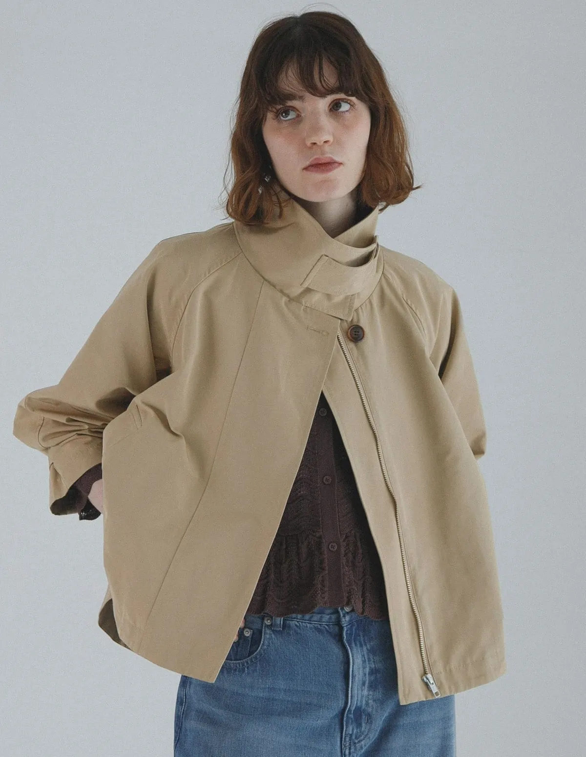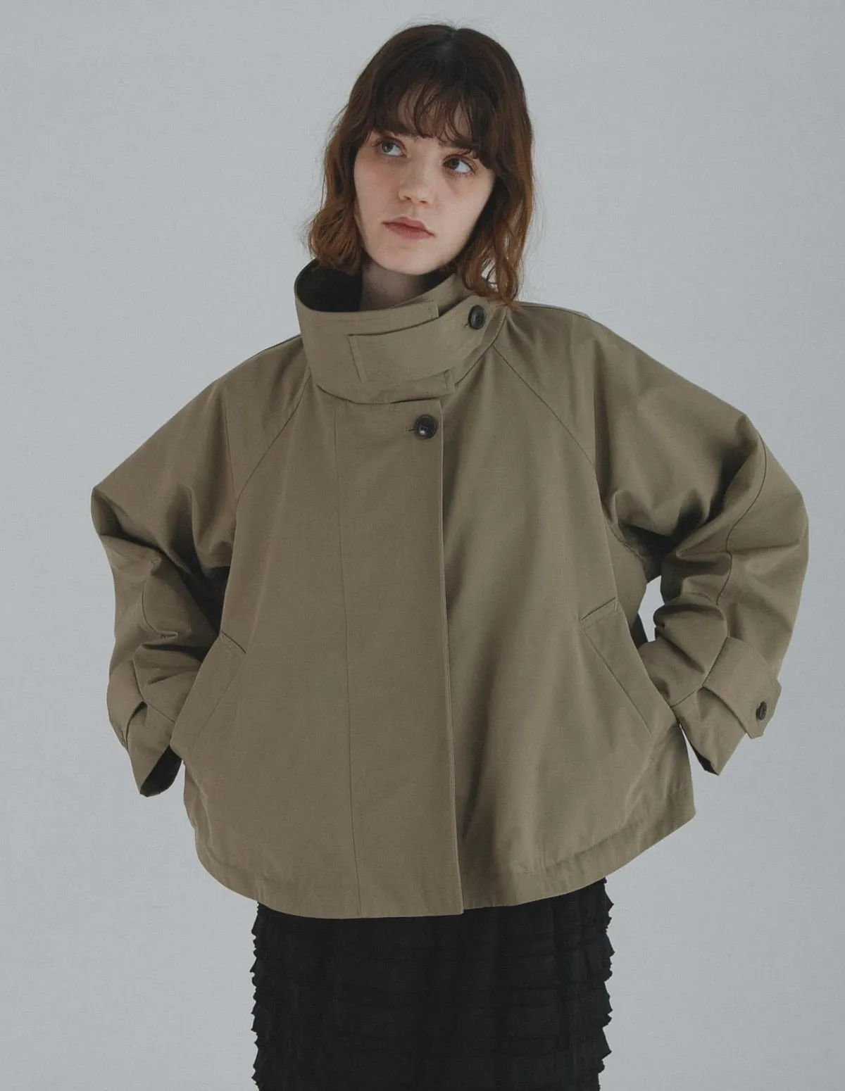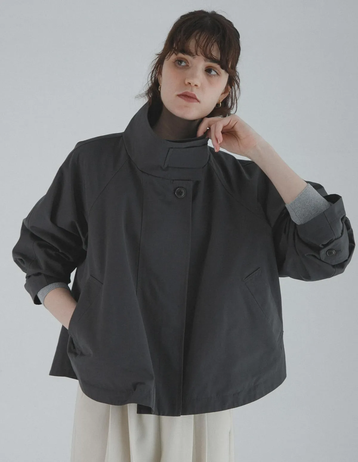 這款短外套扣上領口紐扣,可作為立領外套穿著