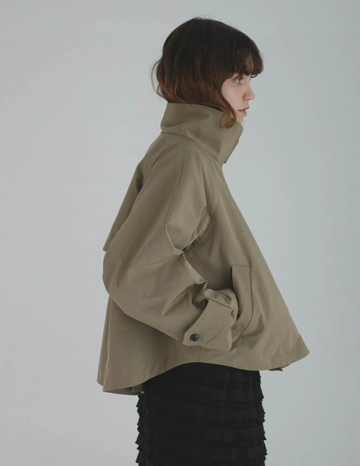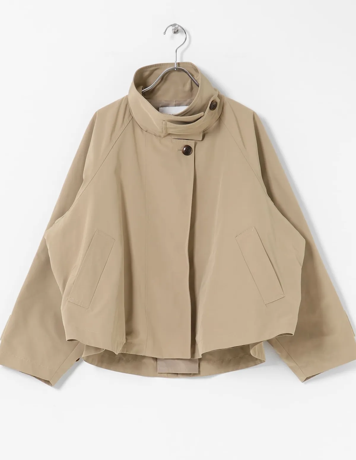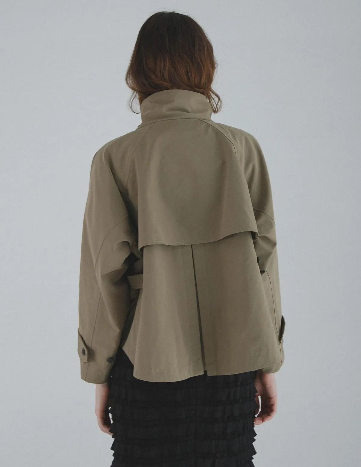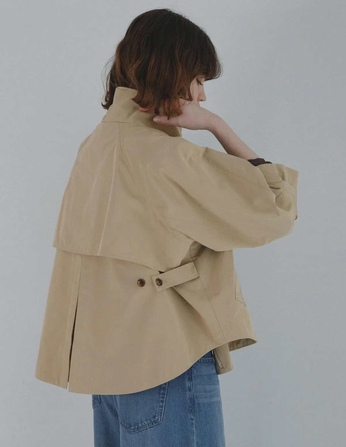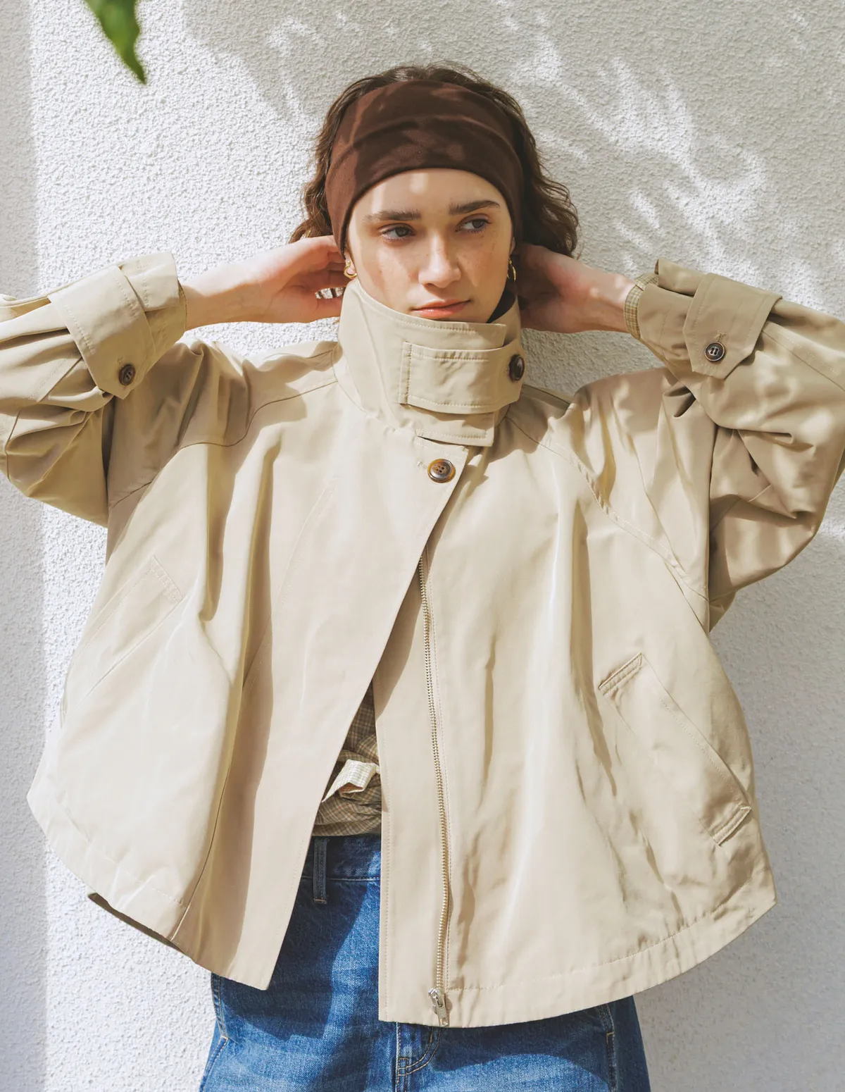 這款短外套扣上領口紐扣,可作為立領外套穿著