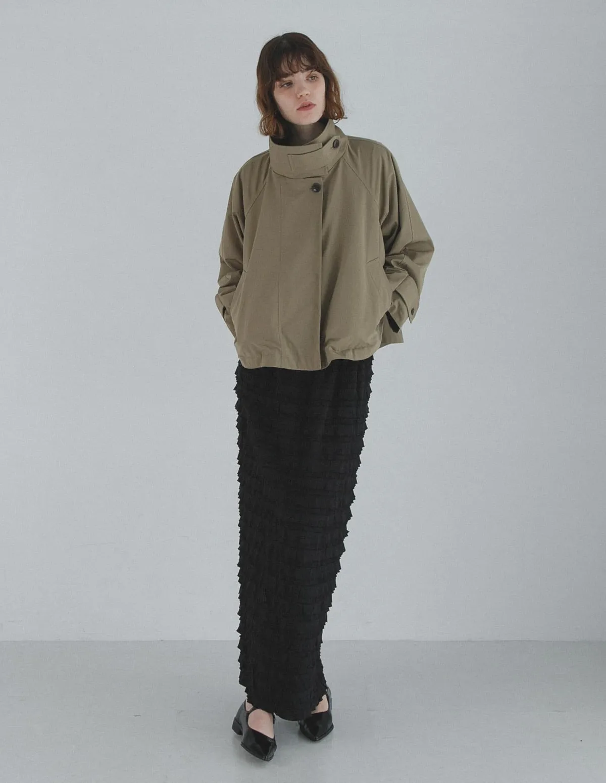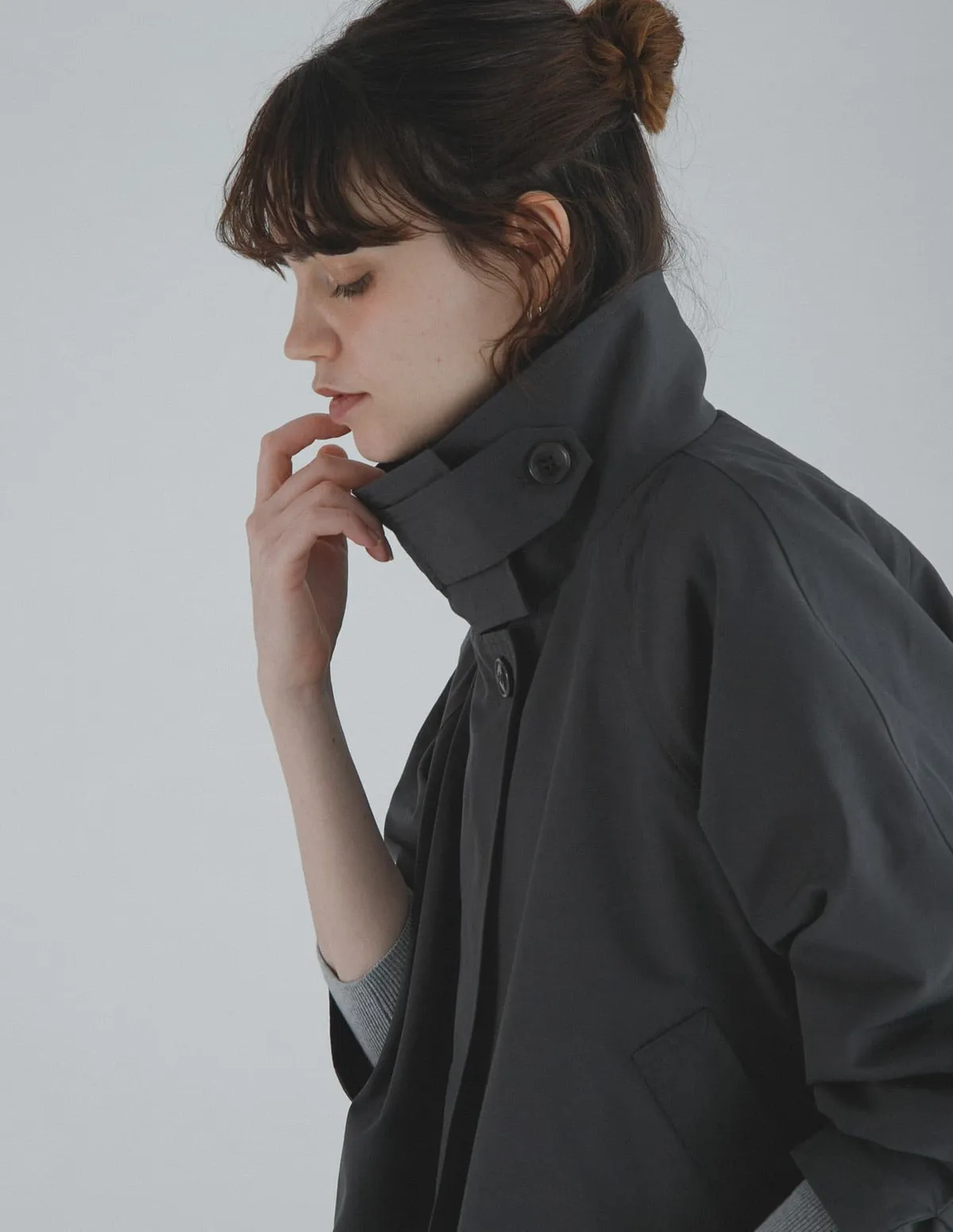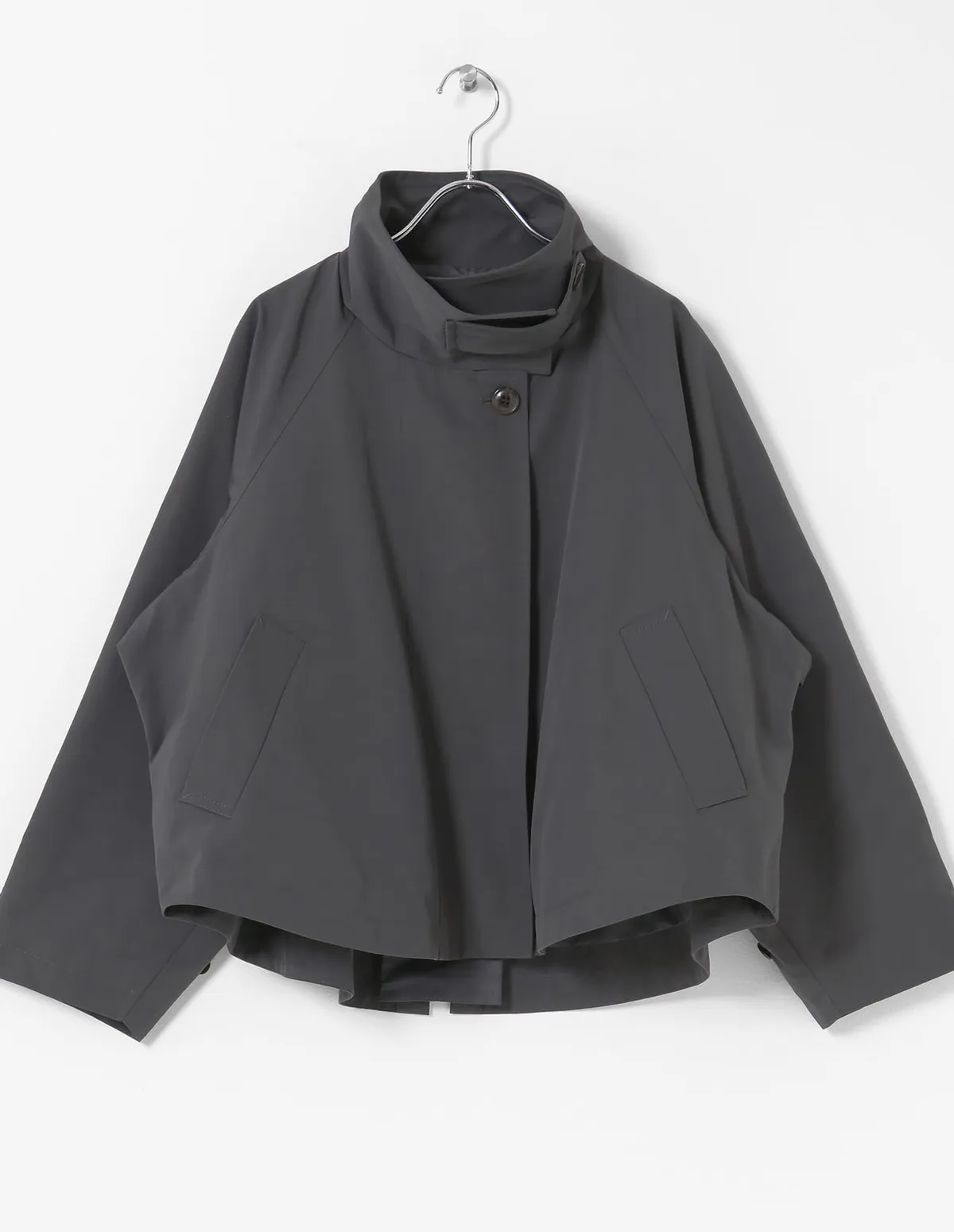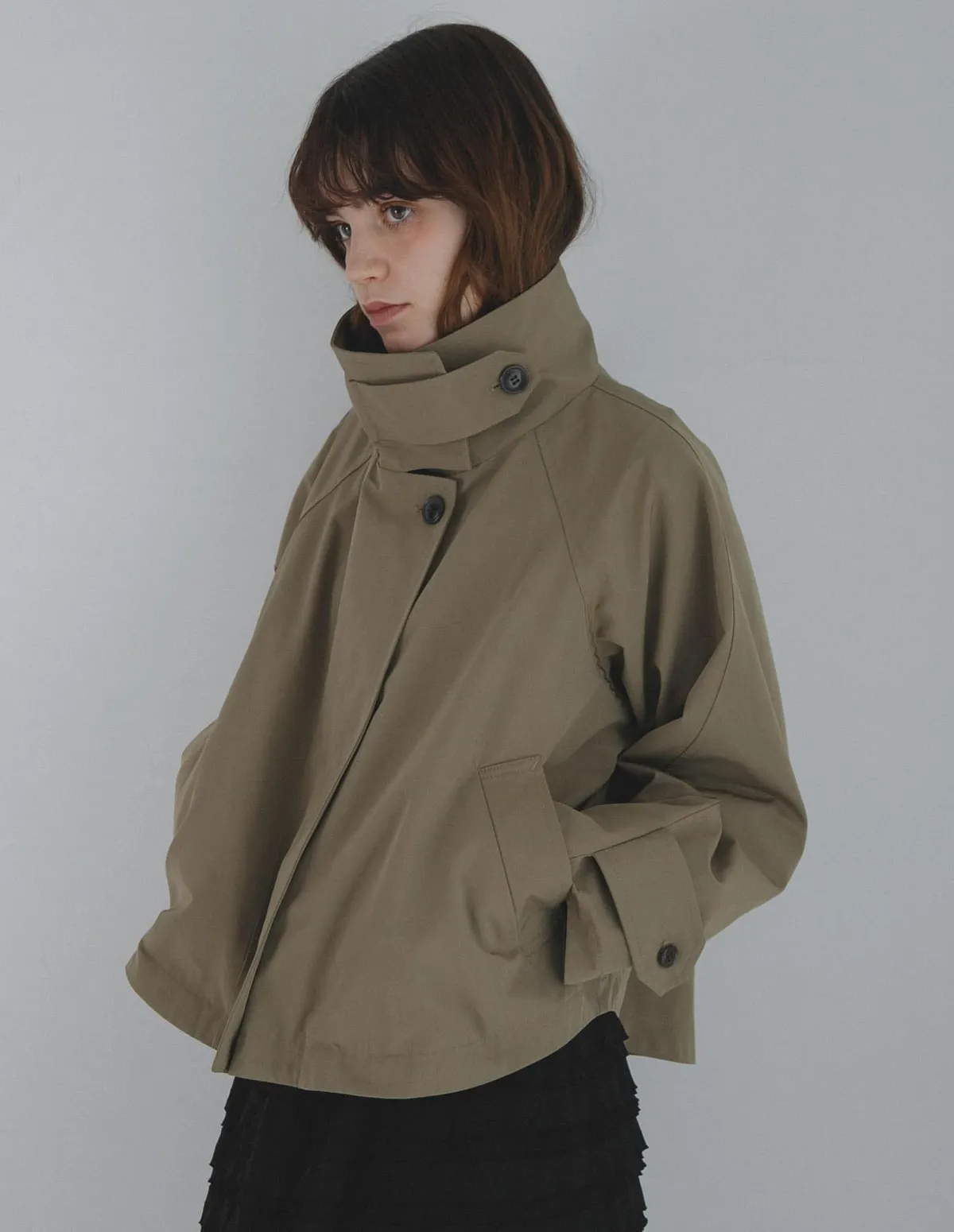 這款短外套扣上領口紐扣,可作為立領外套穿著