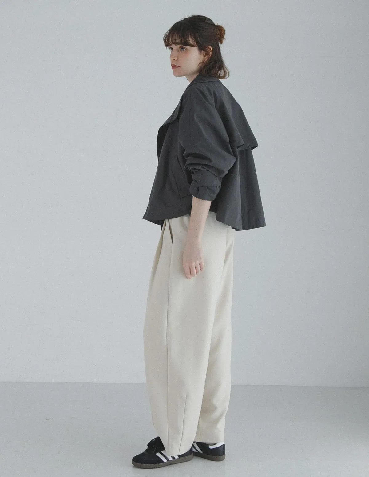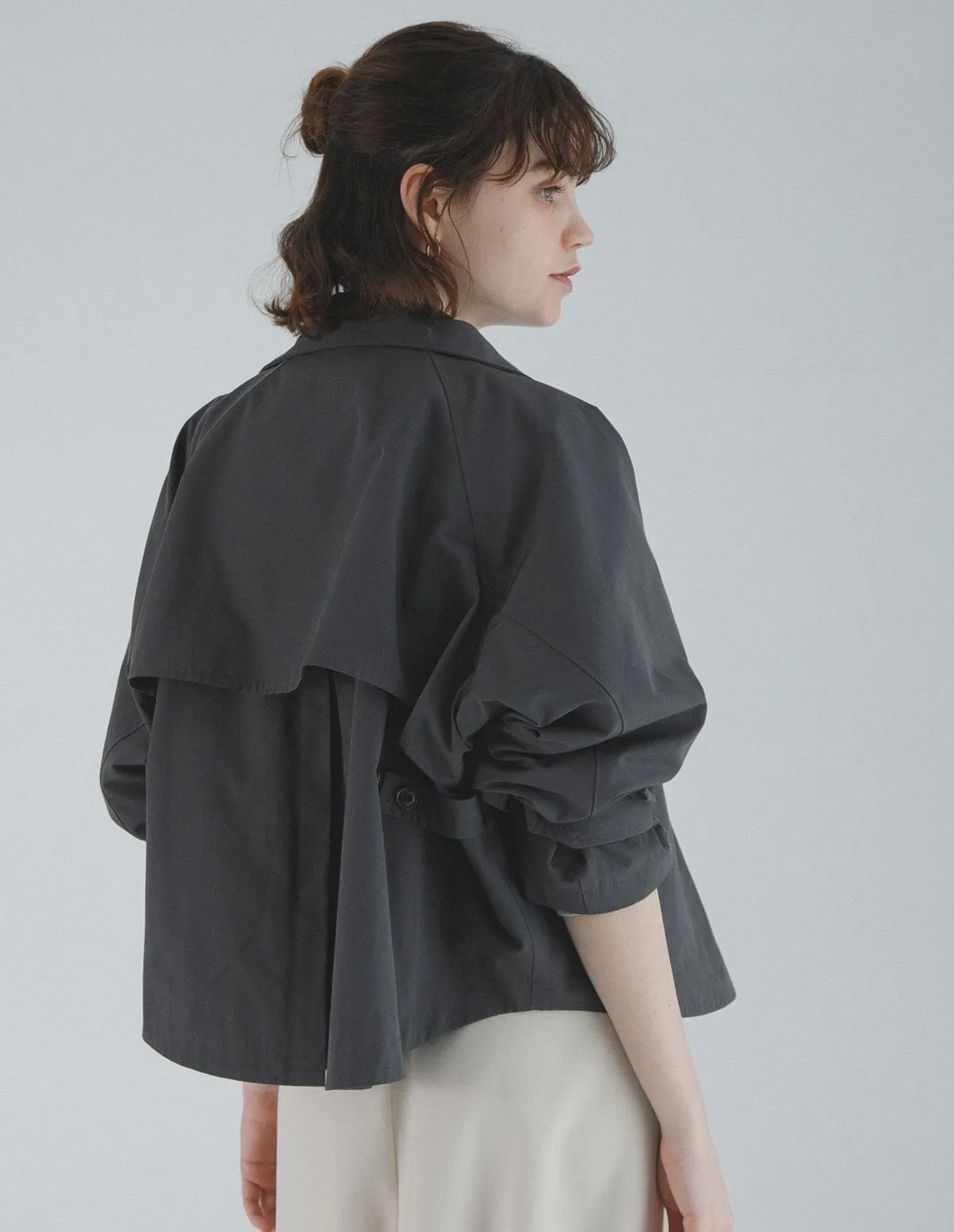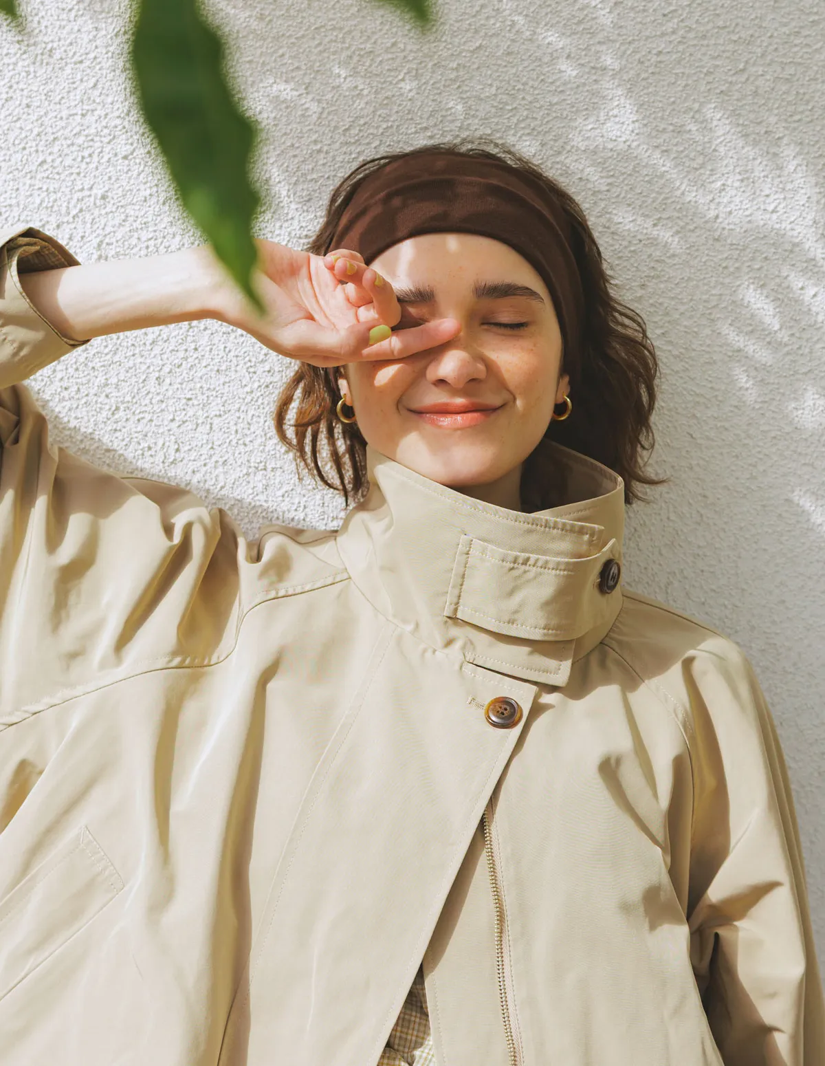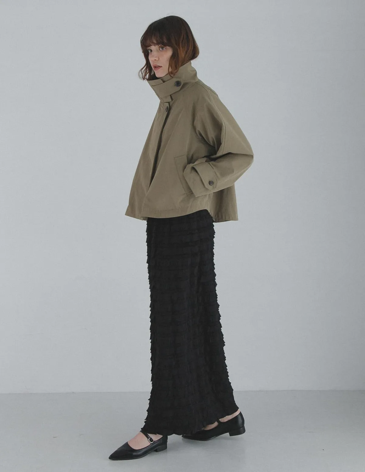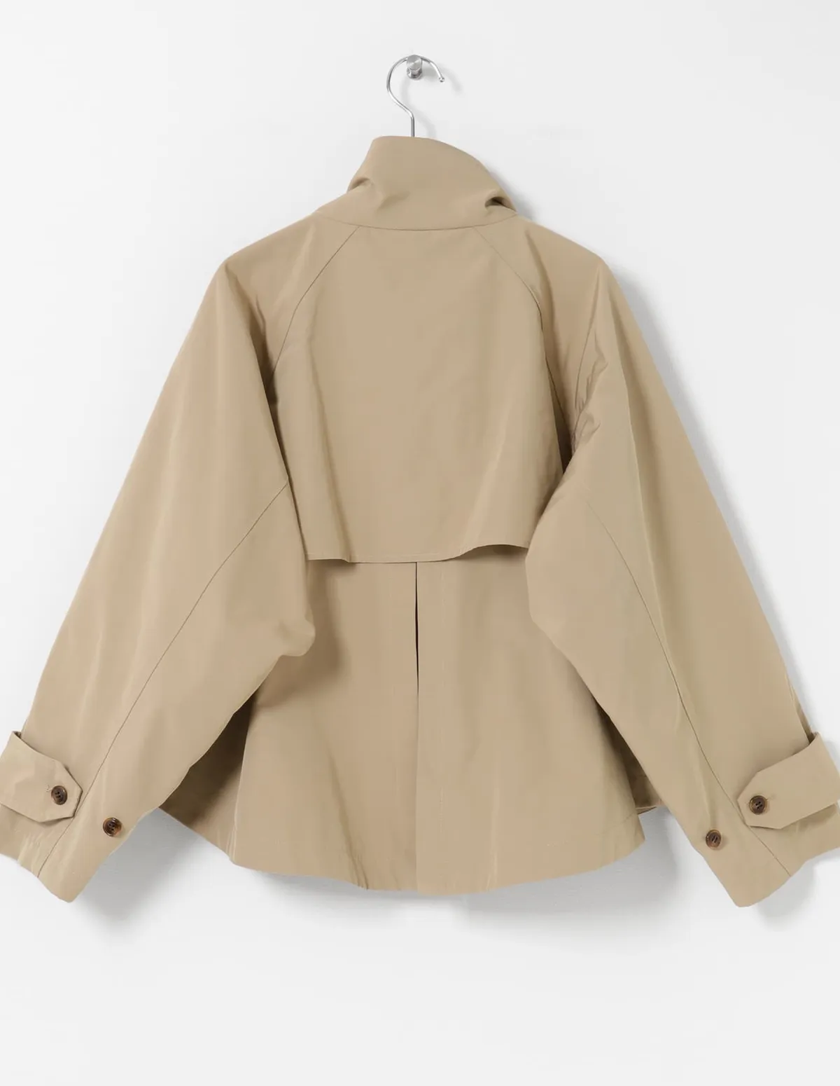 這款短外套扣上領口紐扣,可作為立領外套穿著