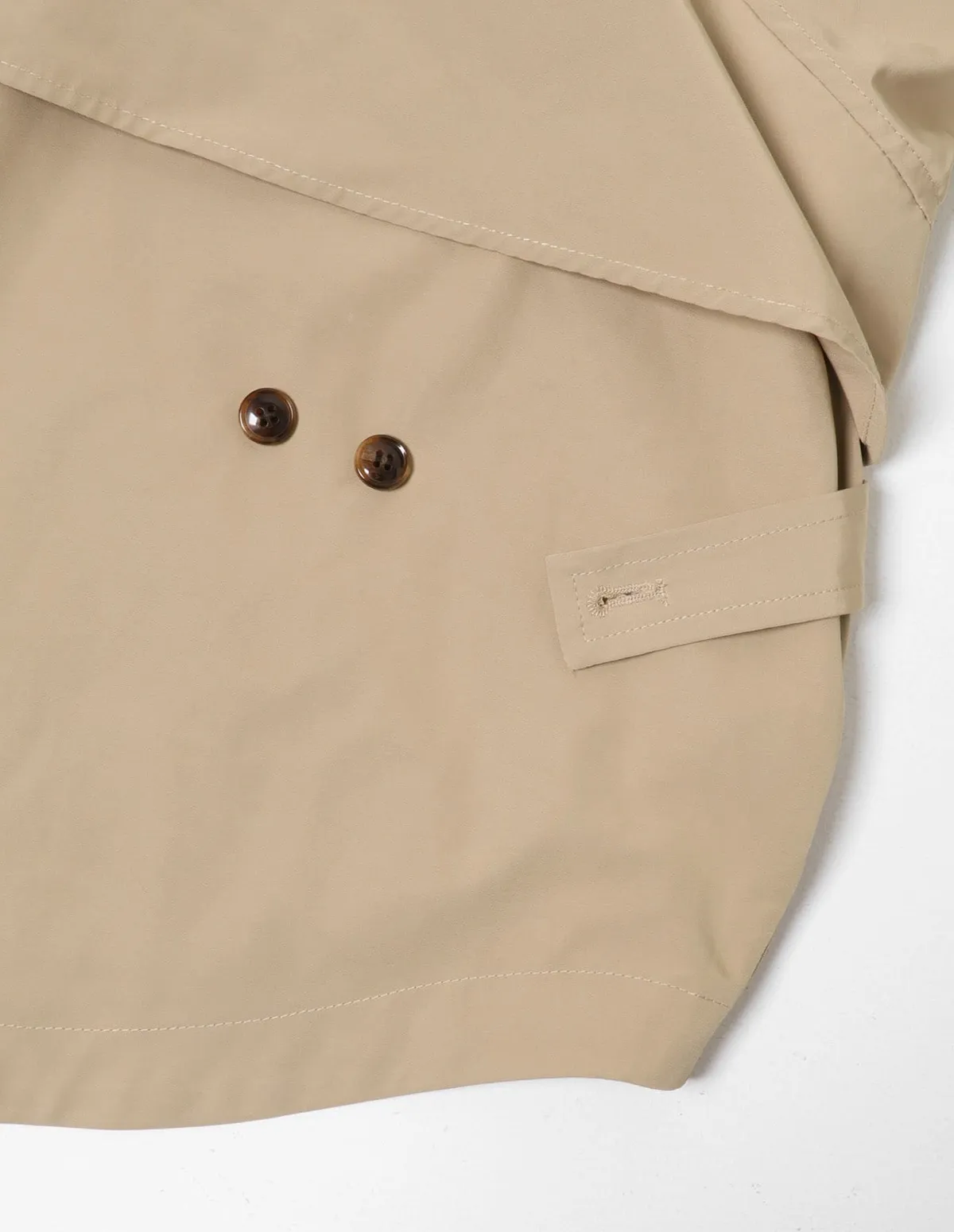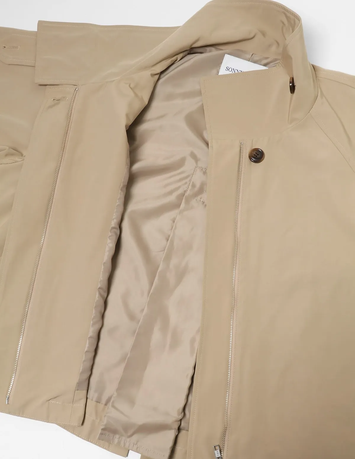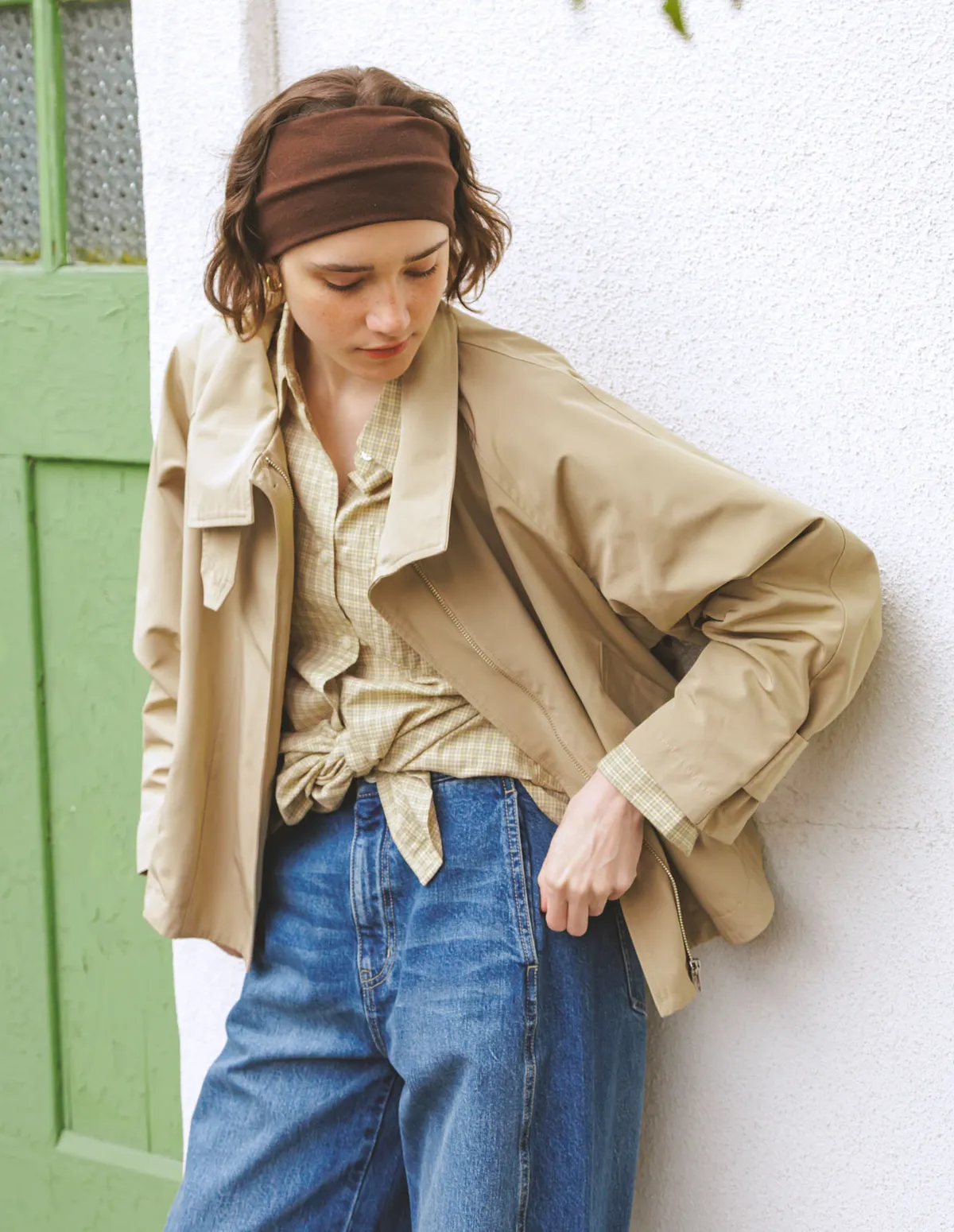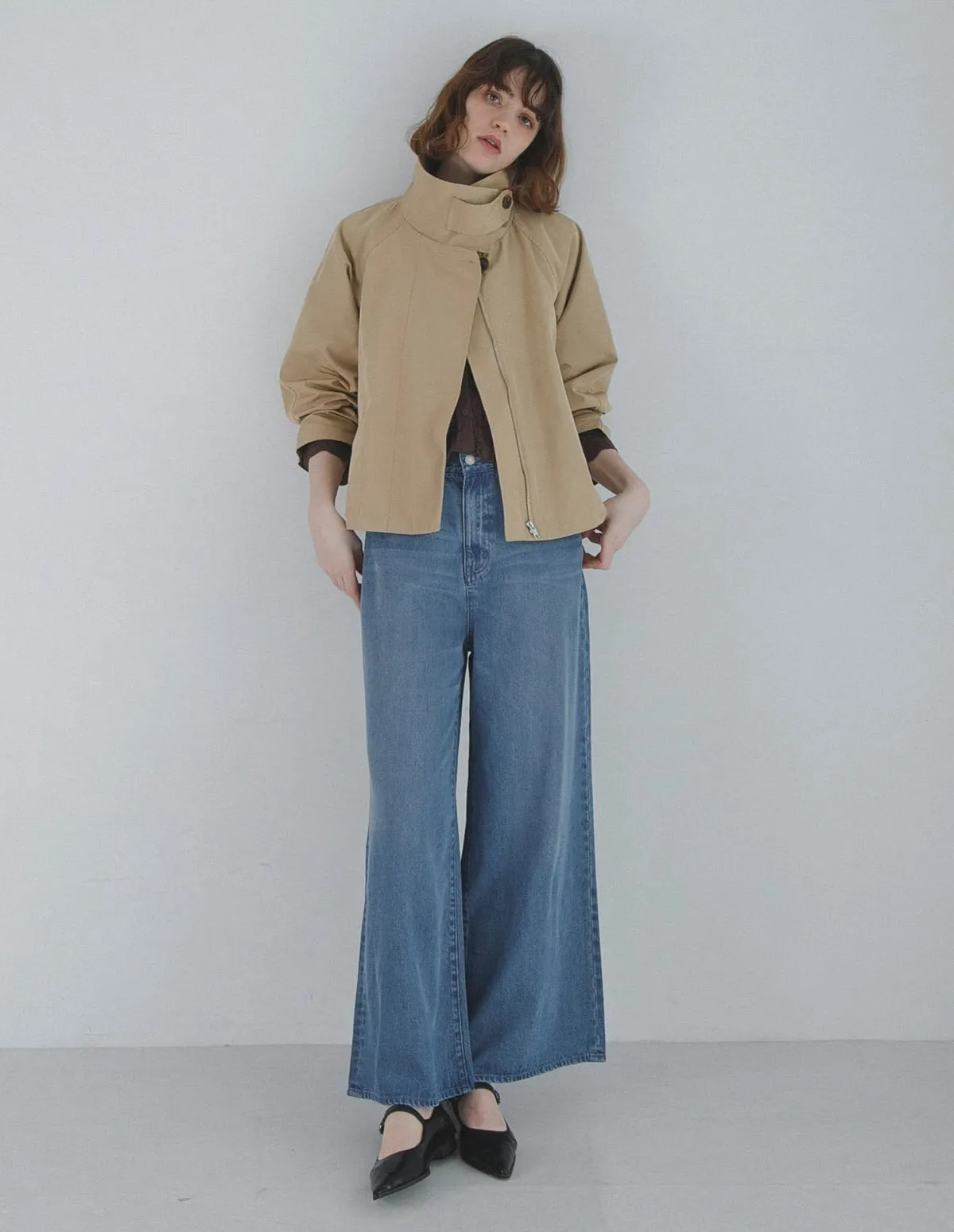 這款短外套扣上領口紐扣,可作為立領外套穿著