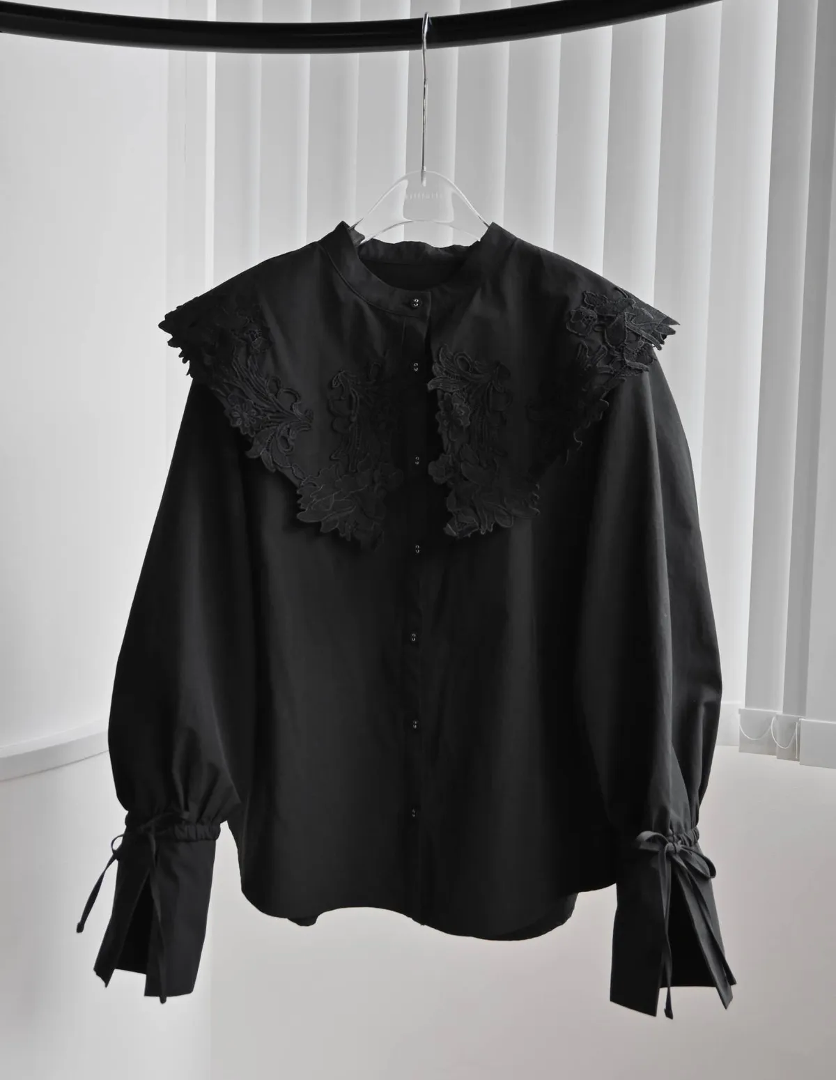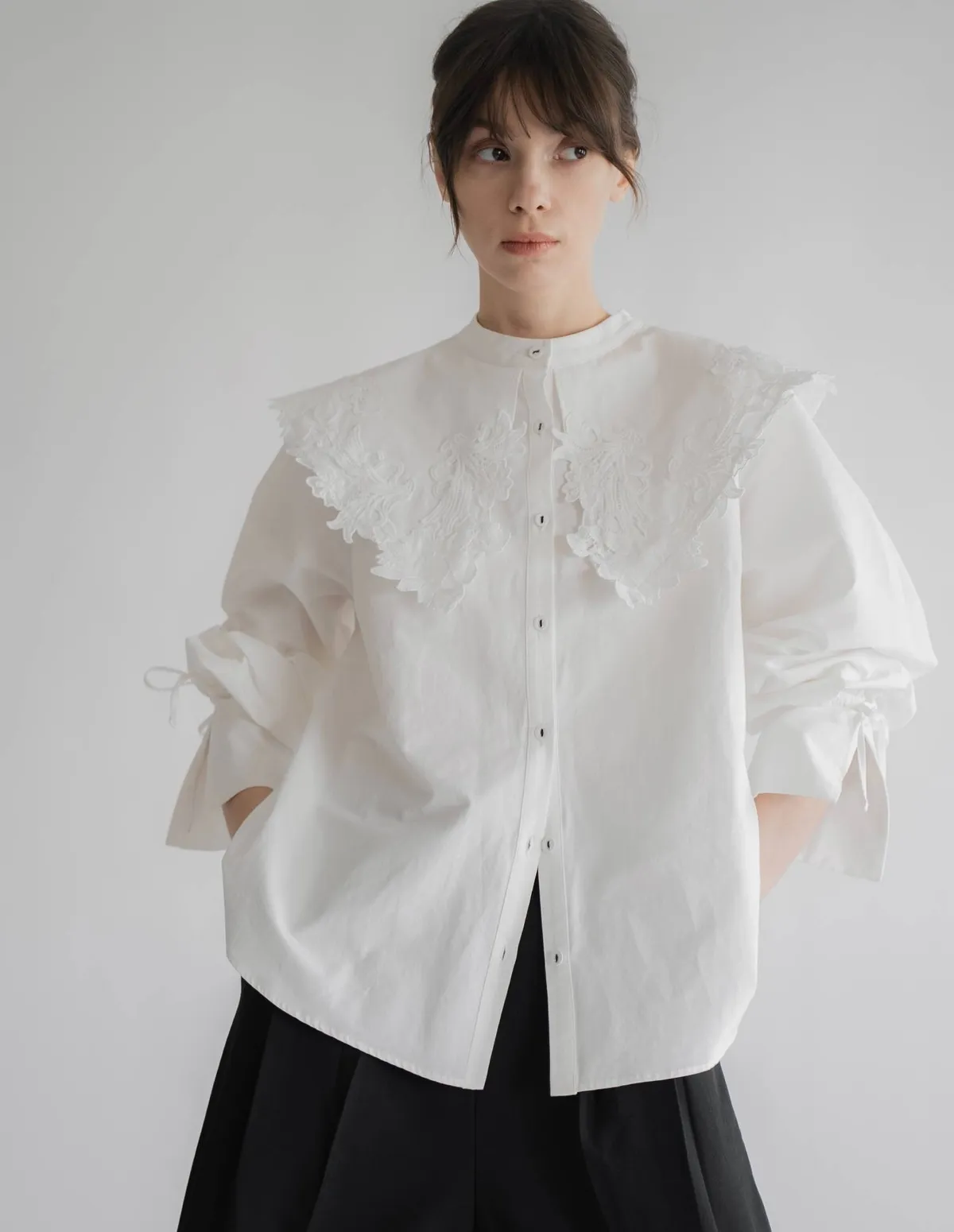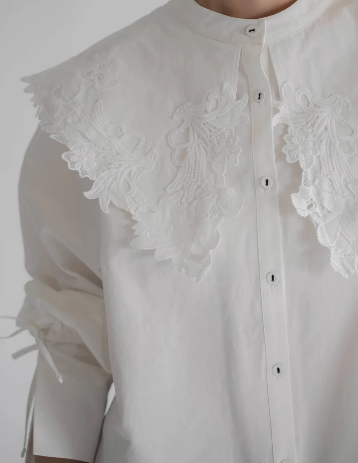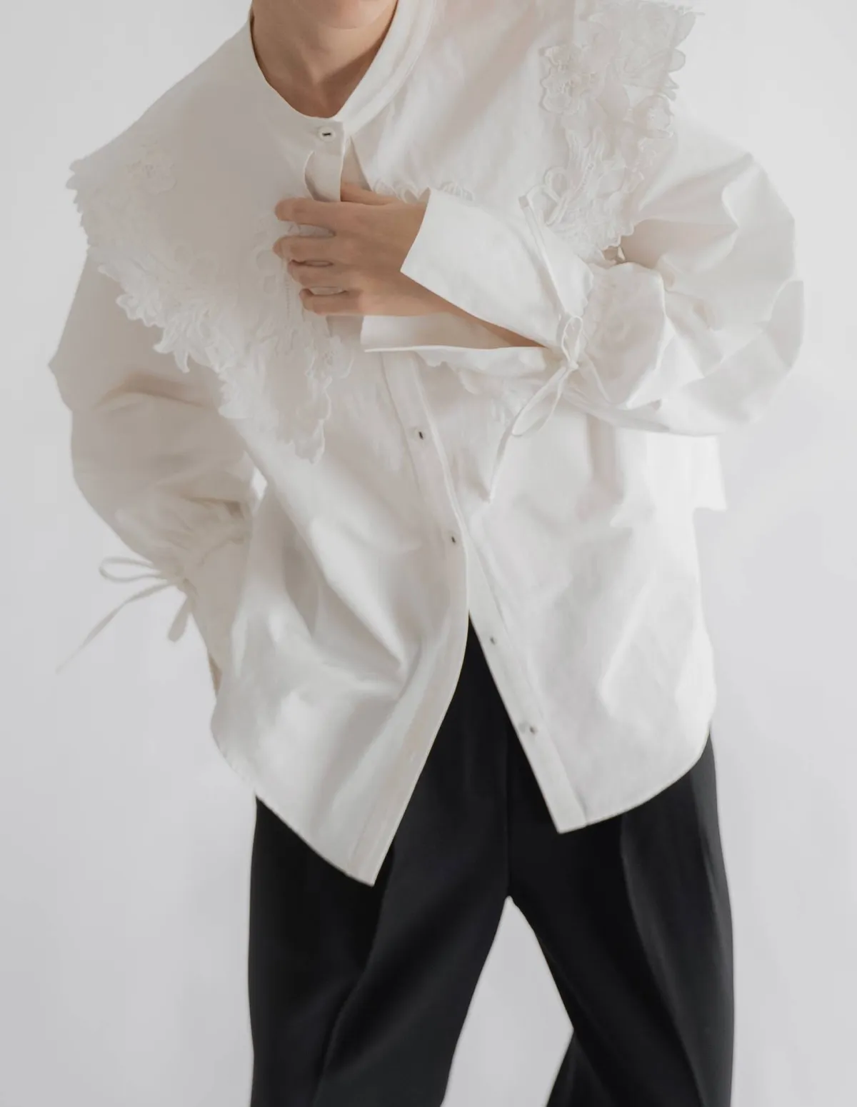 這款襯衫擁有引人注目的蕾絲領,領口設計別緻袖口處的緞帶增添了點綴,袖子可以捲起大領口使其成為整體造型的亮點推薦搭配西裝外套或西裝褲,打造正式又俐落的造型也可以將領口從外套或針織外套下露出來展現另外一種個性風格材質外層布料:58%尼龍,42%棉蕾絲:100%聚酯纖維 此商品為預購商品 到貨時間需等待14~21個工作天 含假日及國定假日 ⚠️急件處理需自行負擔國際運費