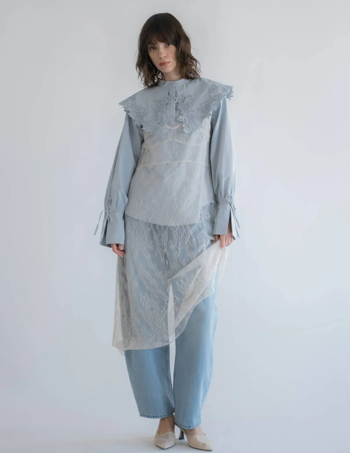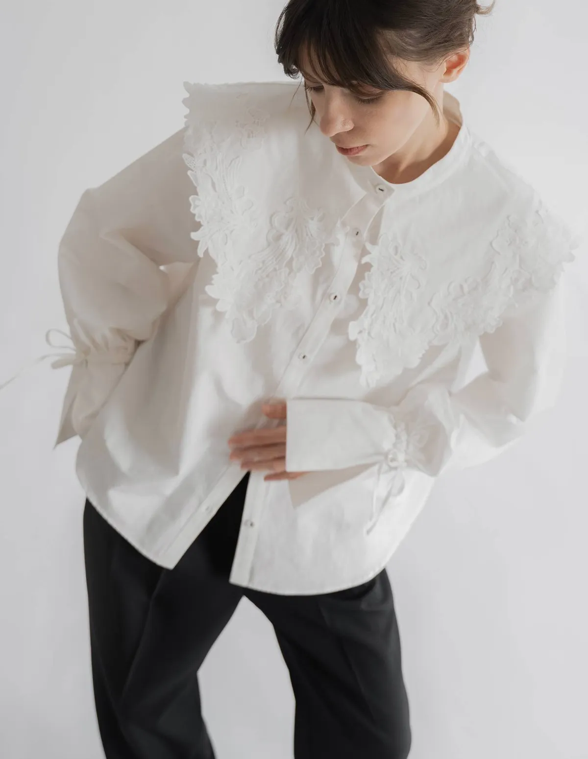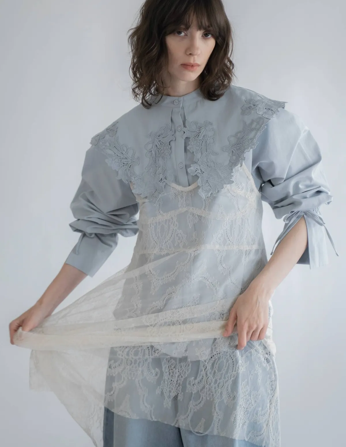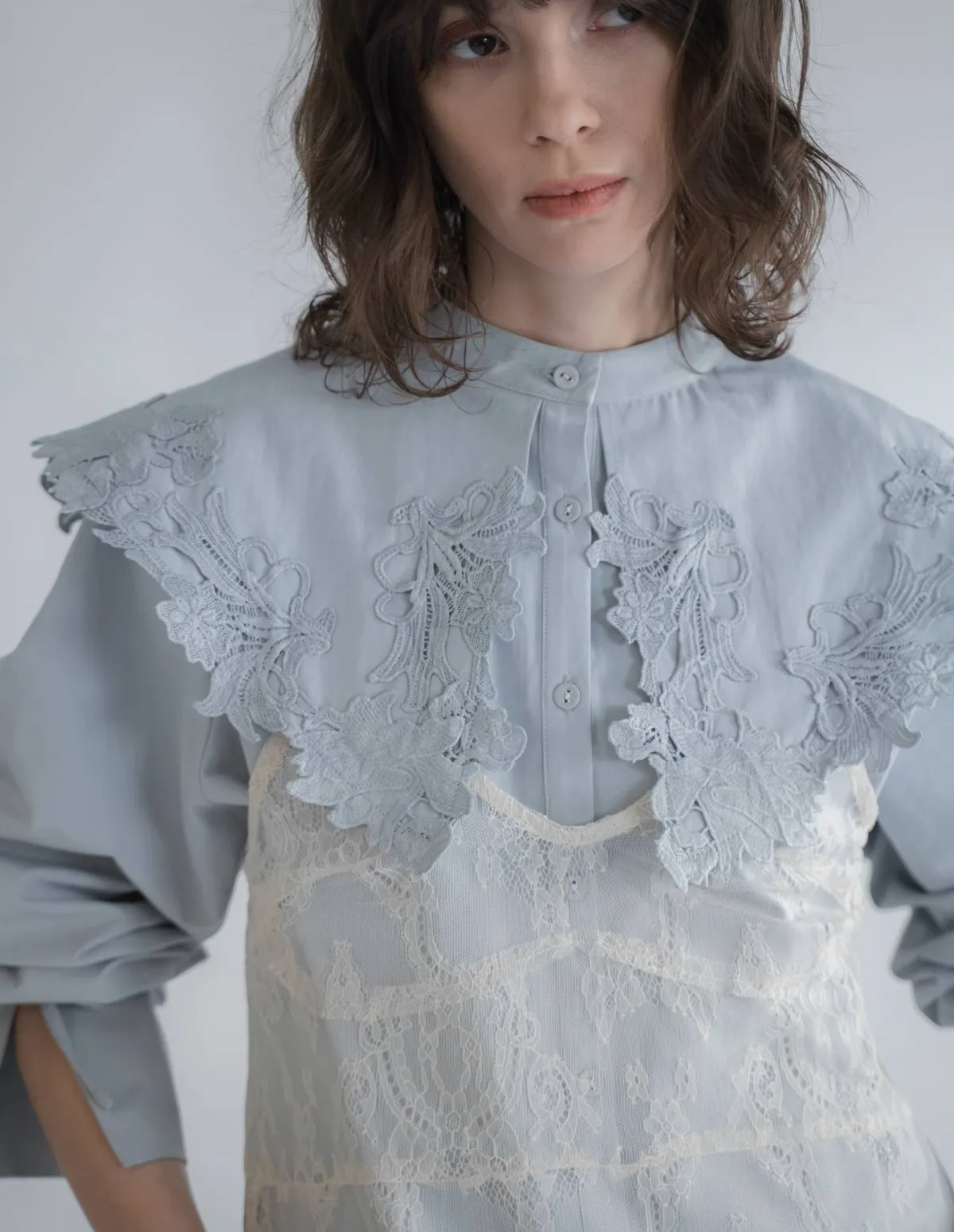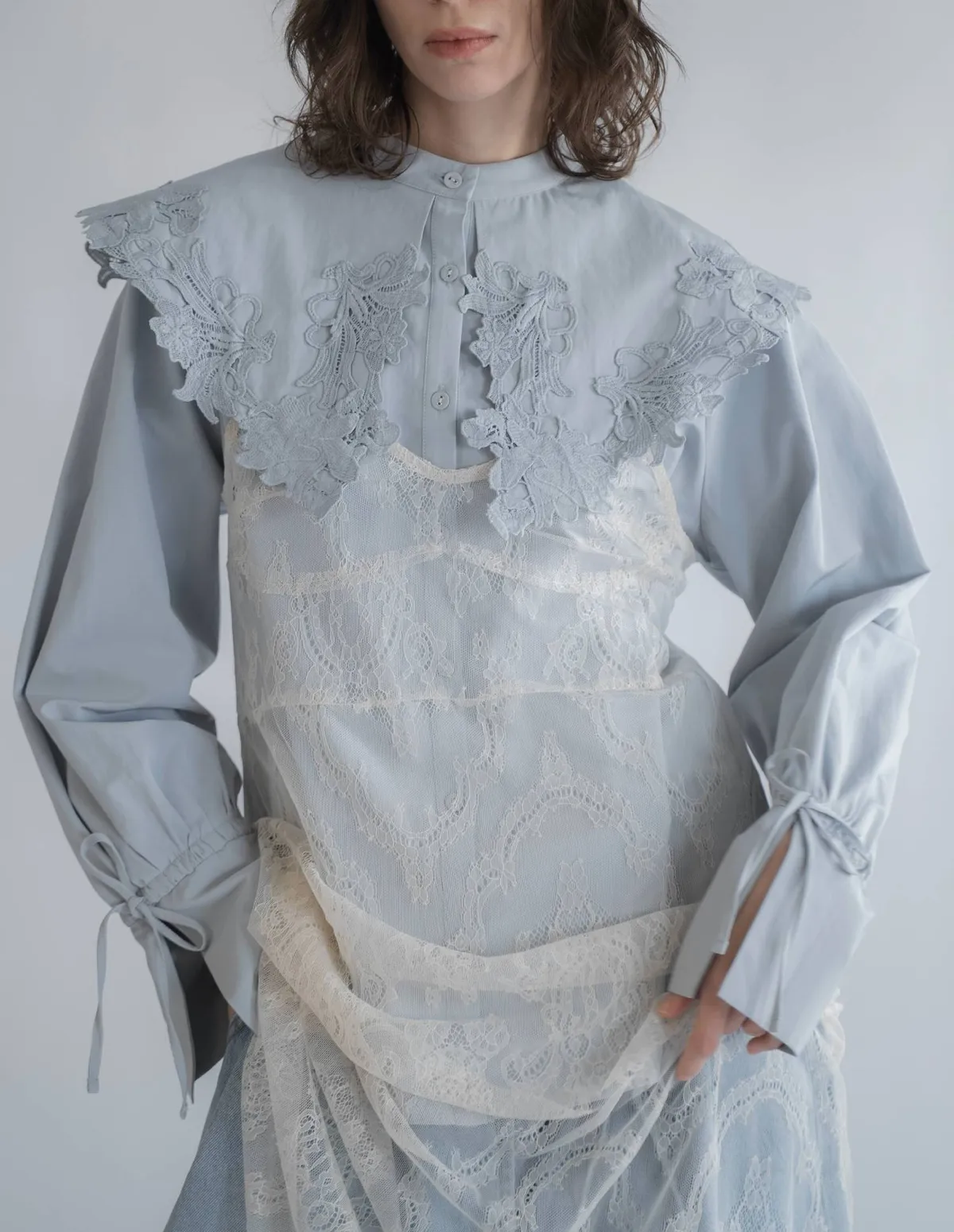 這款襯衫擁有引人注目的蕾絲領,領口設計別緻袖口處的緞帶增添了點綴,袖子可以捲起大領口使其成為整體造型的亮點推薦搭配西裝外套或西裝褲,打造正式又俐落的造型也可以將領口從外套或針織外套下露出來展現另外一種個性風格材質外層布料:58%尼龍,42%棉蕾絲:100%聚酯纖維 此商品為預購商品 到貨時間需等待14~21個工作天 含假日及國定假日 ⚠️急件處理需自行負擔國際運費