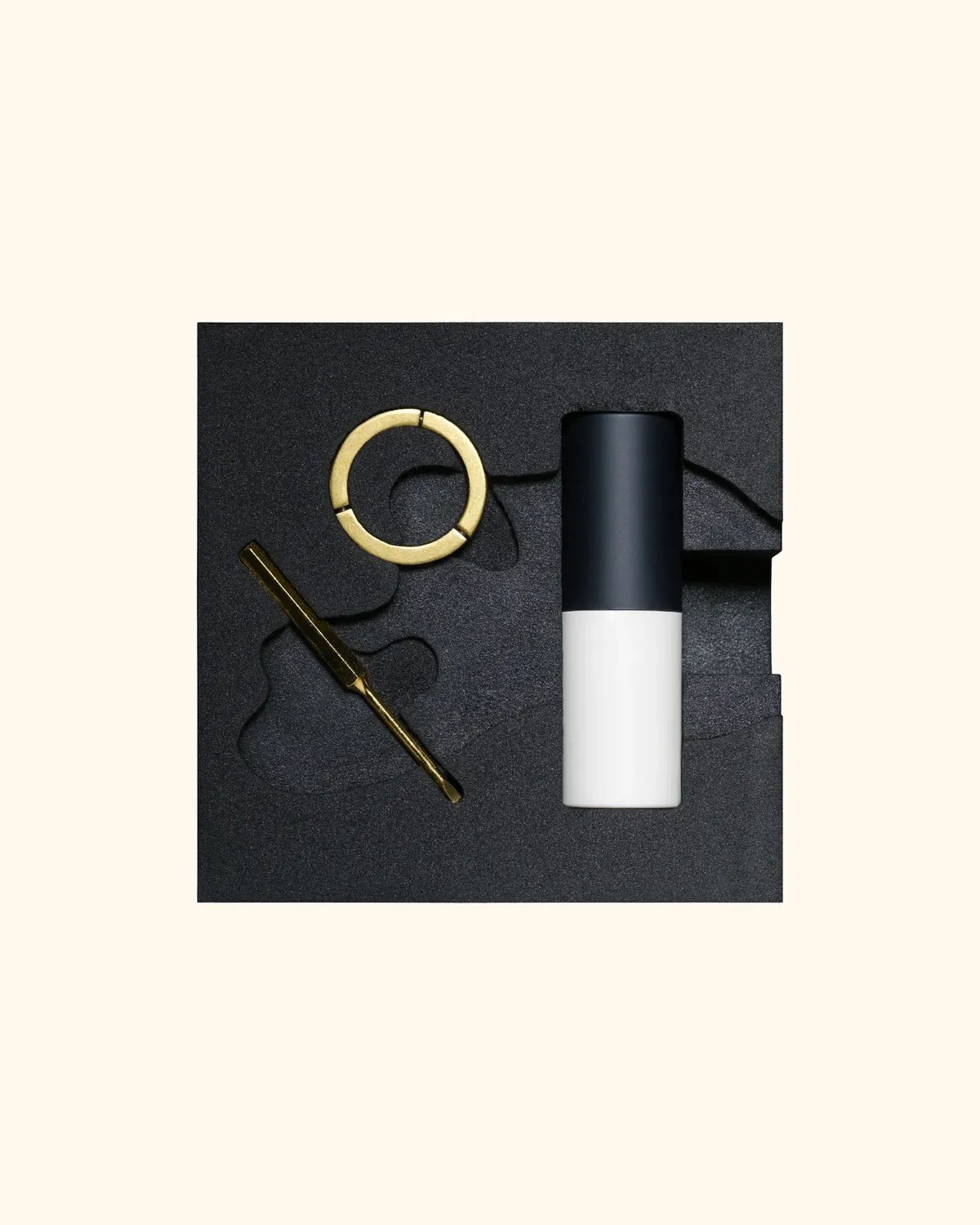 唇部可以重新填充。使用隨附的螺絲起子將環固定在您選擇的位置,並創建獨特的原始唇緣。容器、環和驅動器將裝在一個特殊的盒子裡。