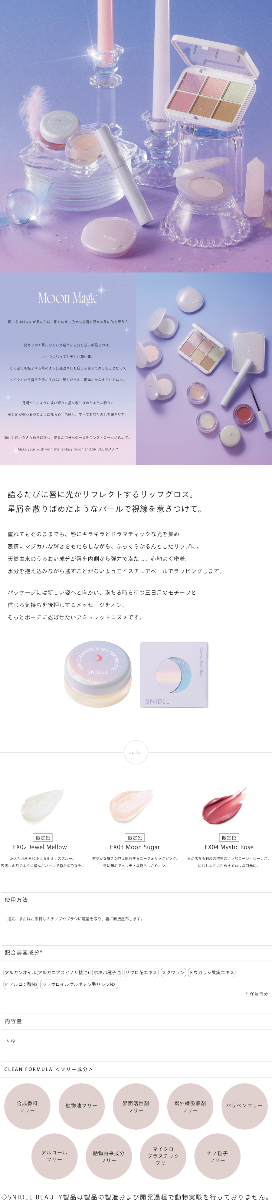 說話的時候嘴脣上就會反射出光澤的唇彩像星星碎片一樣的珍珠吸引視線 疊加塗抹或保持原樣,爲雙唇增添閃耀光彩 爲表情帶來魔幻閃耀光彩,打造豐盈豐盈的唇妝 天然滋潤成分充滿彈性能舒適貼合雙唇 用保溼面膜包裹嘴唇的概念確保水分不會流失 共三色日本製 / 重量6.3g 此商品為預購商品 到貨時間需等待10~21個工作天 不含假日及國定假日 ⚠️急件處理需自行負擔國際運費
