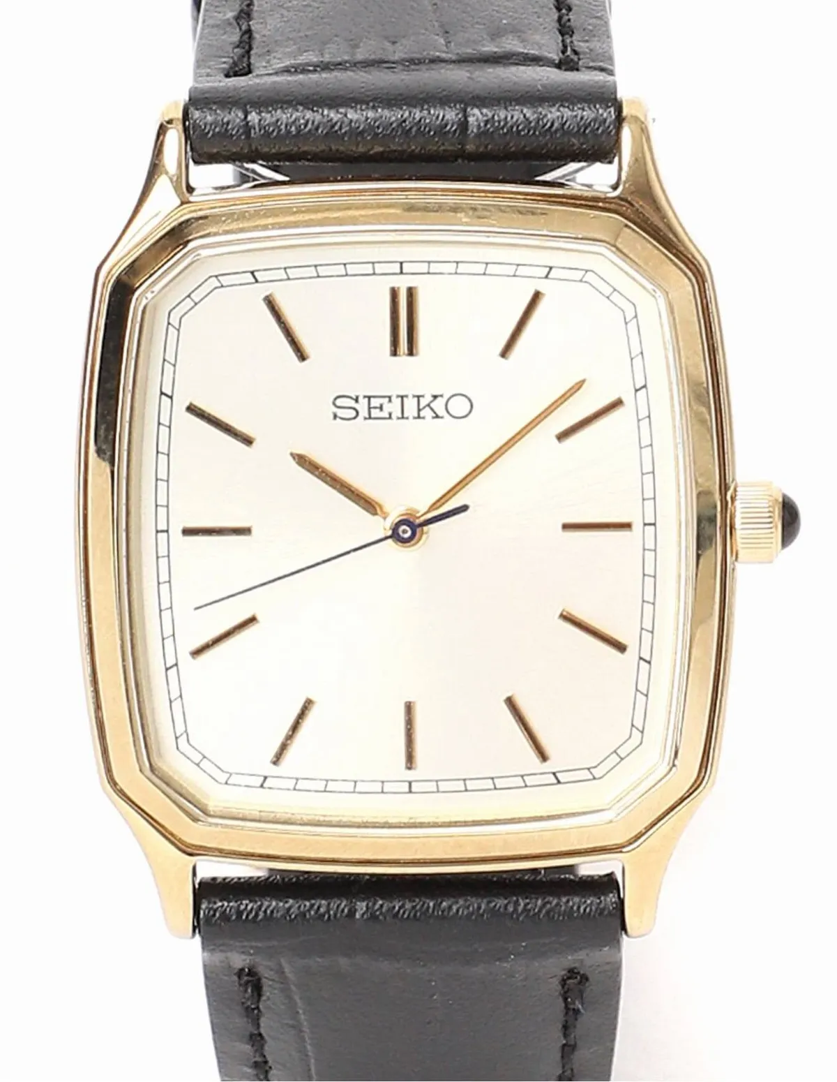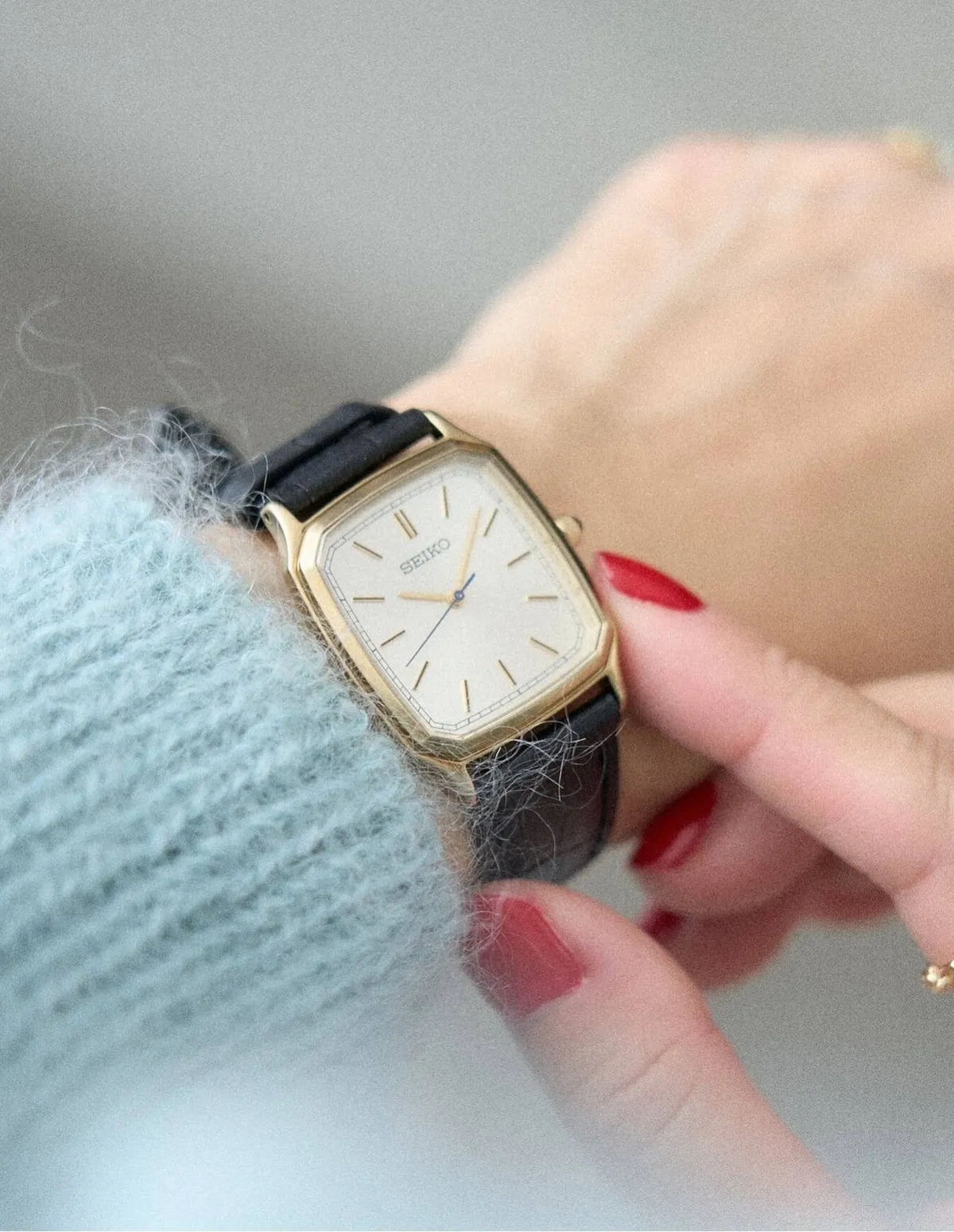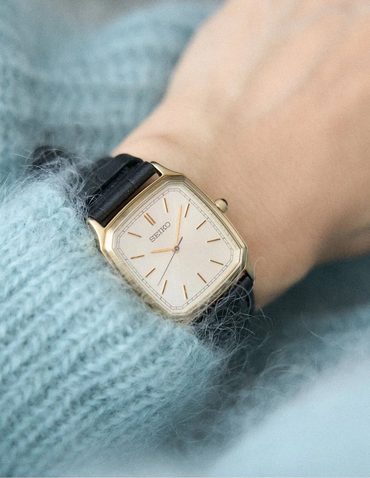 溫暖的香檳金色錶盤搭配低調的藍色秒針