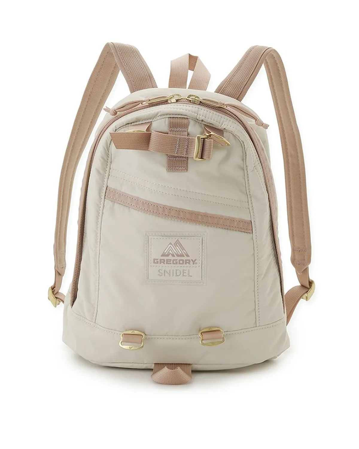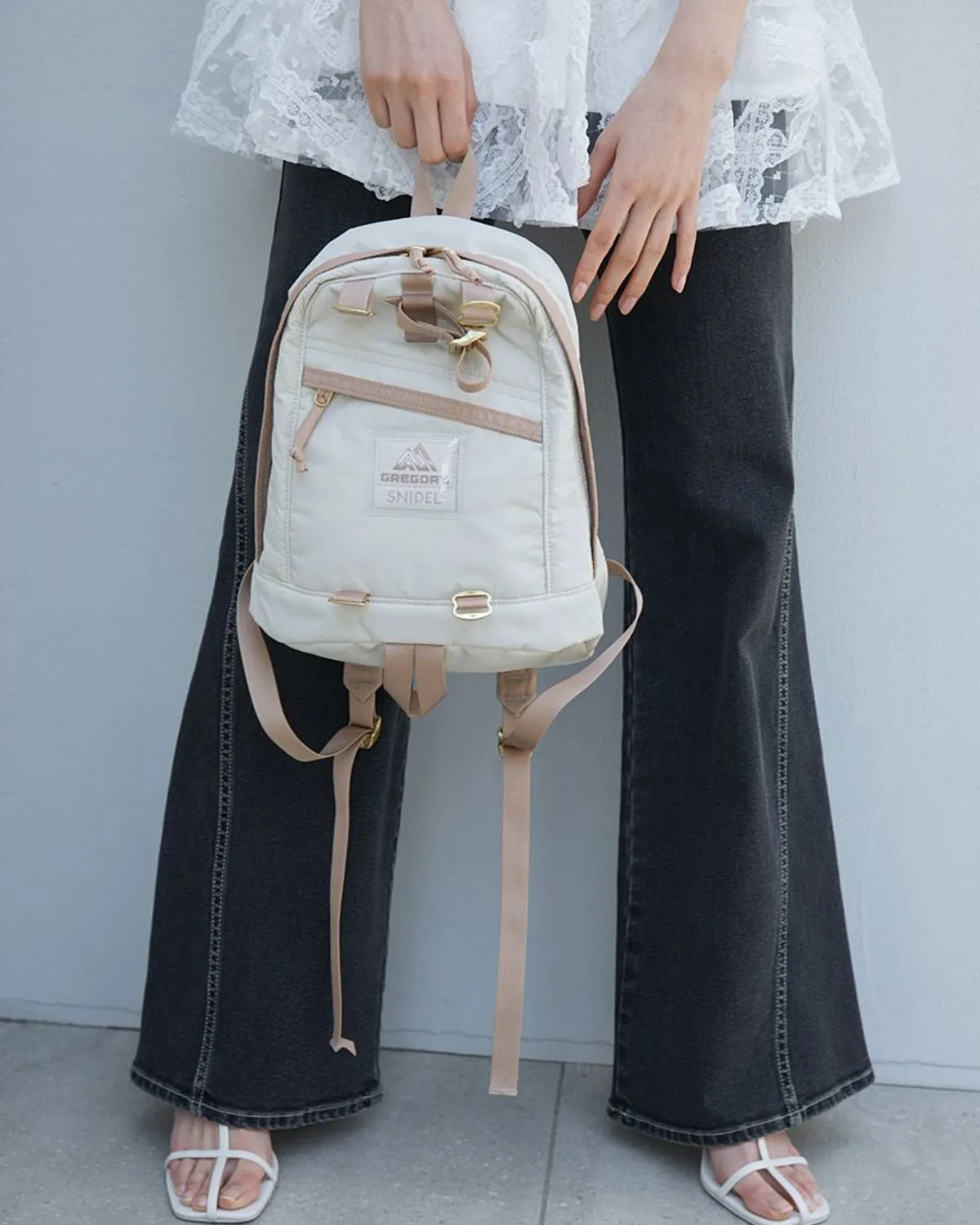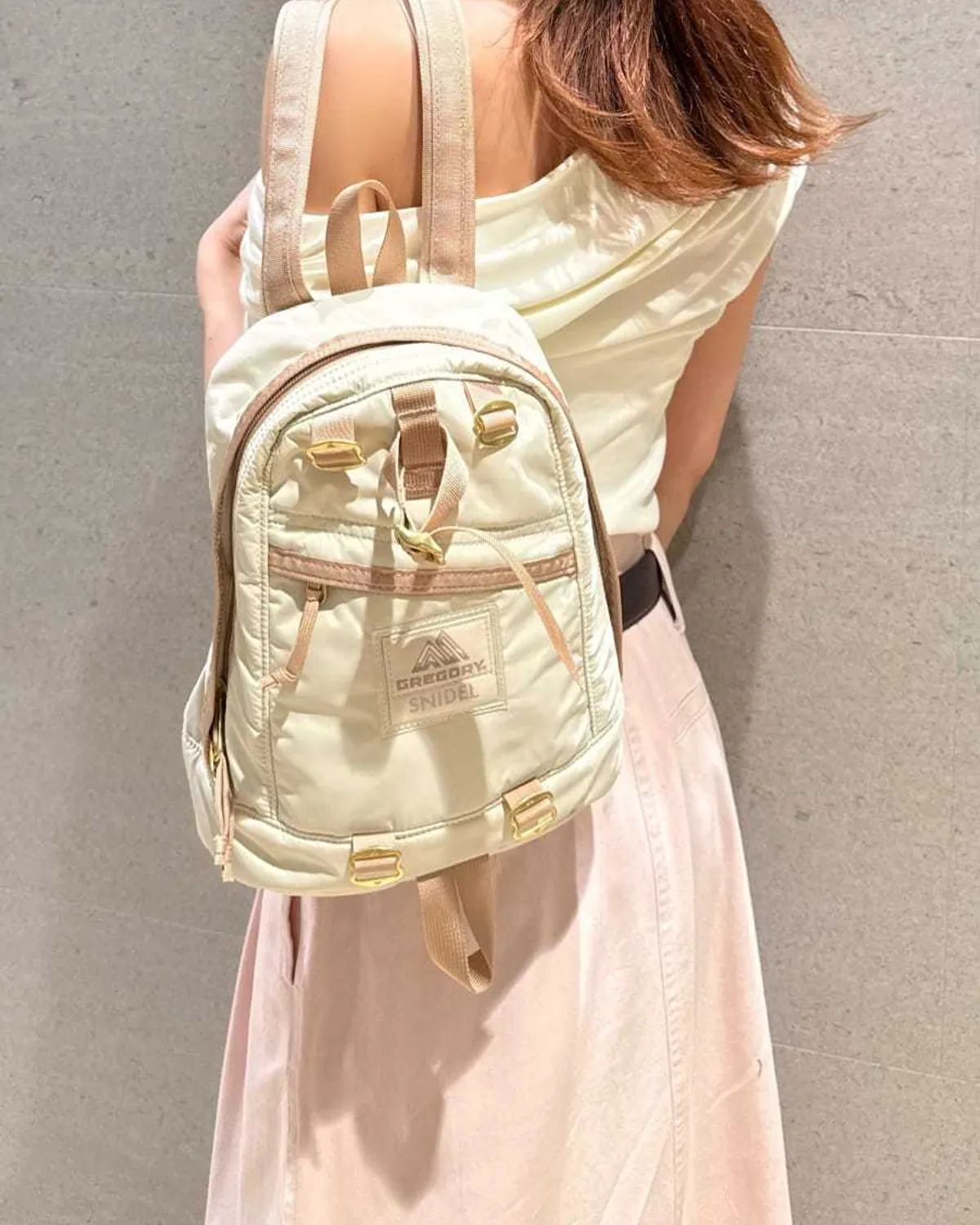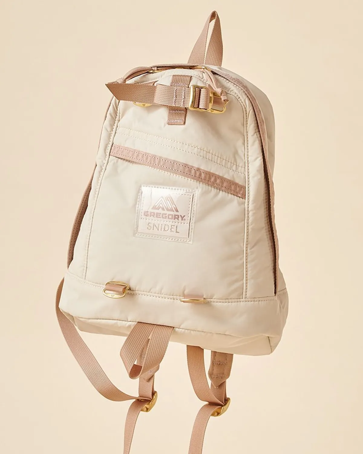 NIDEL x GREGORY 聯名款GREGORY Fine Day系列迷你後背包柔和象牙白 x 粉米色的配色跟SNIDEL家的服裝也很好搭配是一年四季都可以使用的單品這款迷你後背包兼具功能性和舒適性揹起來的舒適度極佳包包點綴著閃粉線製成的 SNIDEL LOGO和金色金屬配件等可愛配件雖然是迷你尺寸但收納容量很足夠非常實用材質外層:100%尼龍內襯:100%尼龍 此商品為預購商品 到貨時間需等待10~21個工作天 不含假日及國定假日 ⚠️急件處理需自行負擔國際運費