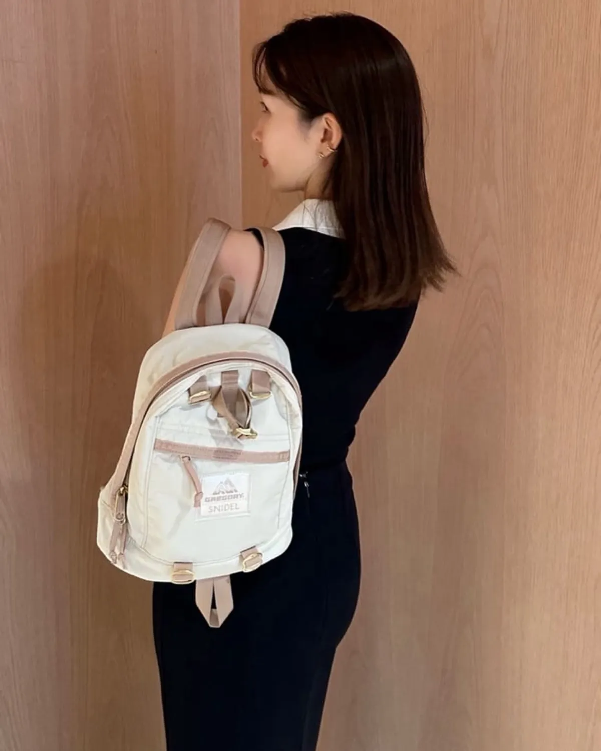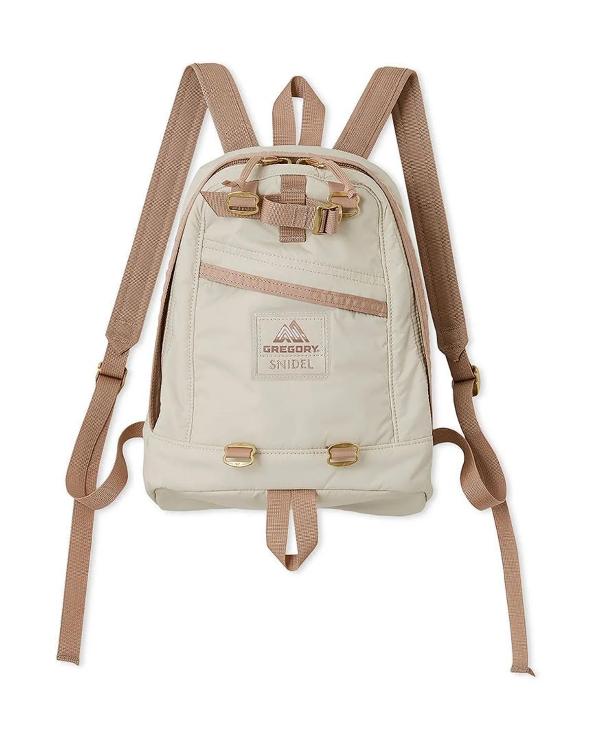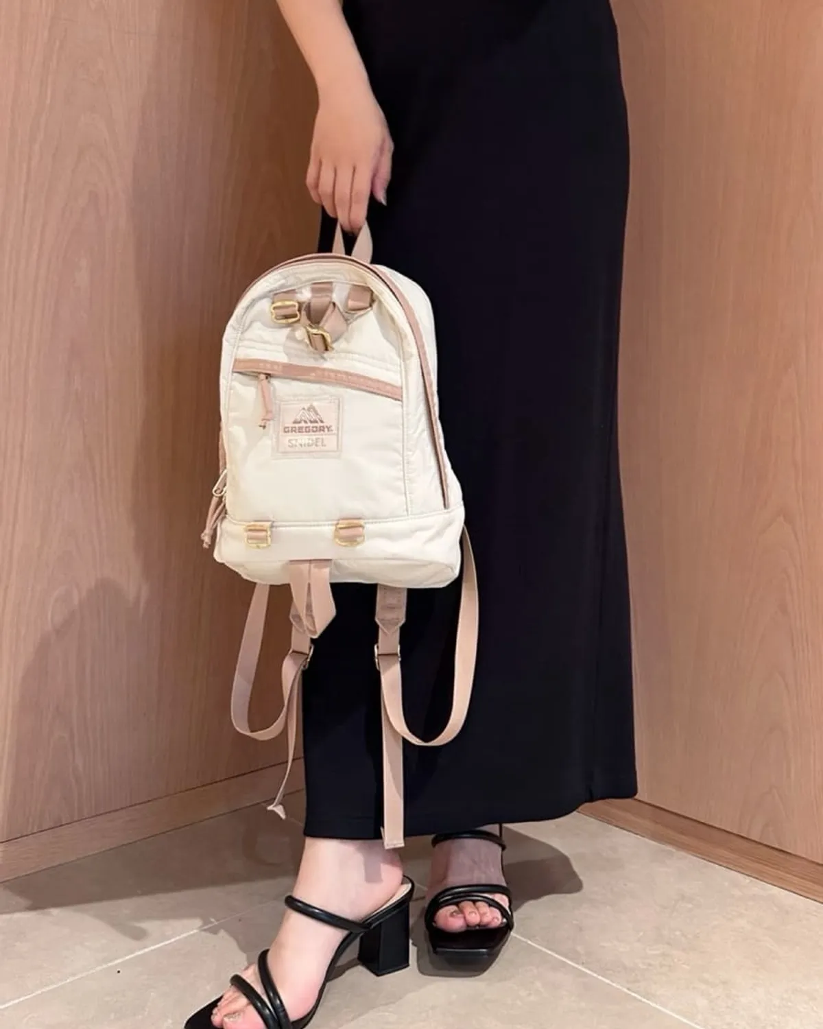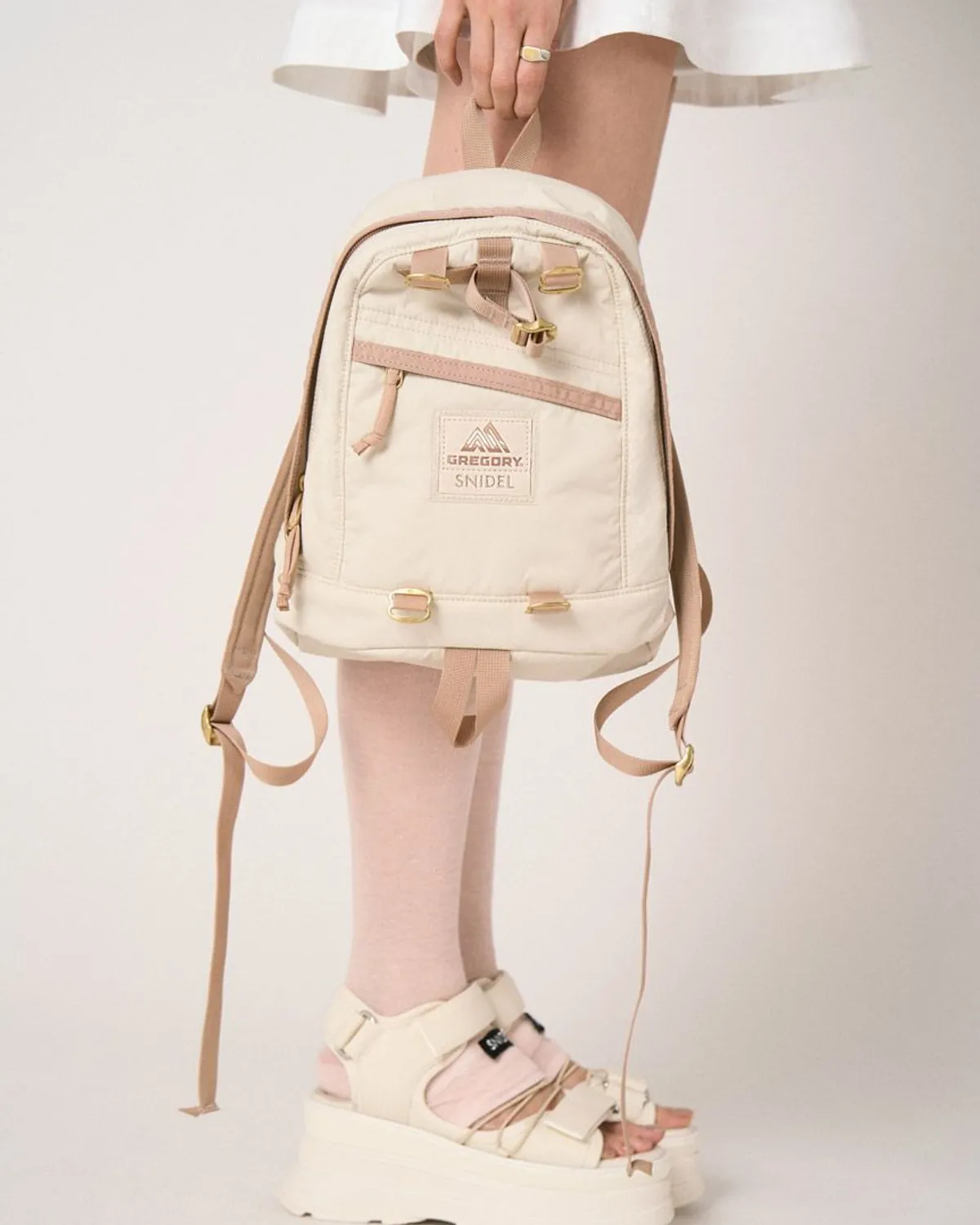NIDEL x GREGORY 聯名款GREGORY Fine Day系列迷你後背包柔和象牙白 x 粉米色的配色跟SNIDEL家的服裝也很好搭配是一年四季都可以使用的單品這款迷你後背包兼具功能性和舒適性揹起來的舒適度極佳包包點綴著閃粉線製成的 SNIDEL LOGO和金色金屬配件等可愛配件雖然是迷你尺寸但收納容量很足夠非常實用材質外層:100%尼龍內襯:100%尼龍 此商品為預購商品 到貨時間需等待10~21個工作天 不含假日及國定假日 ⚠️急件處理需自行負擔國際運費