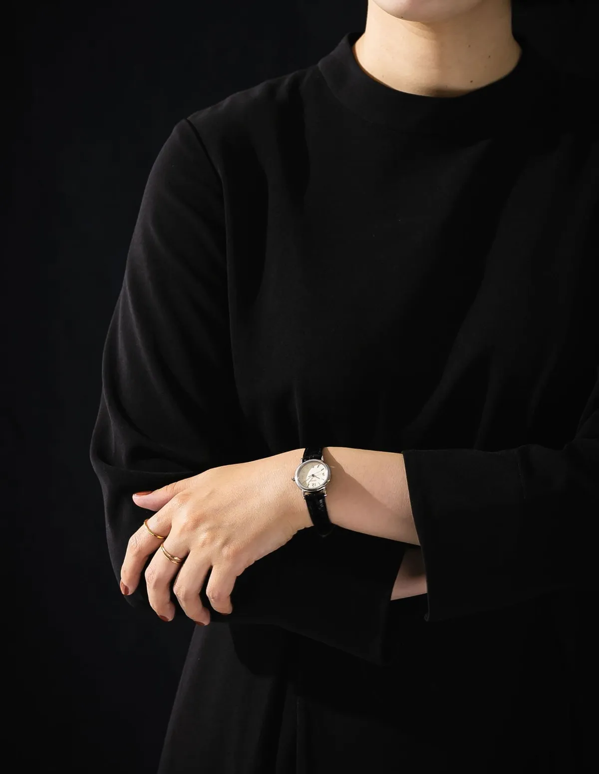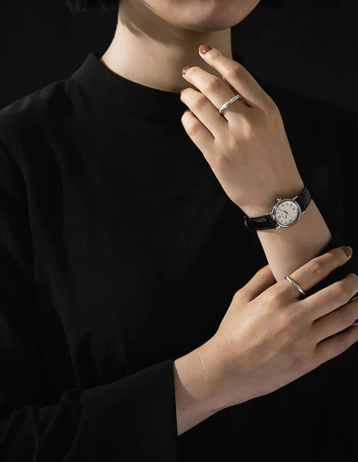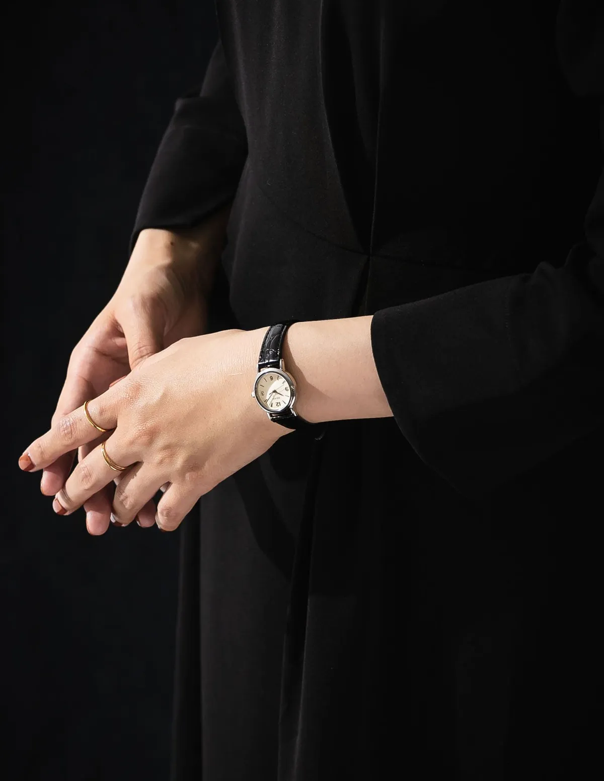象牙色錶盤搭配立體阿拉伯數字時標,與膚色渾然一體