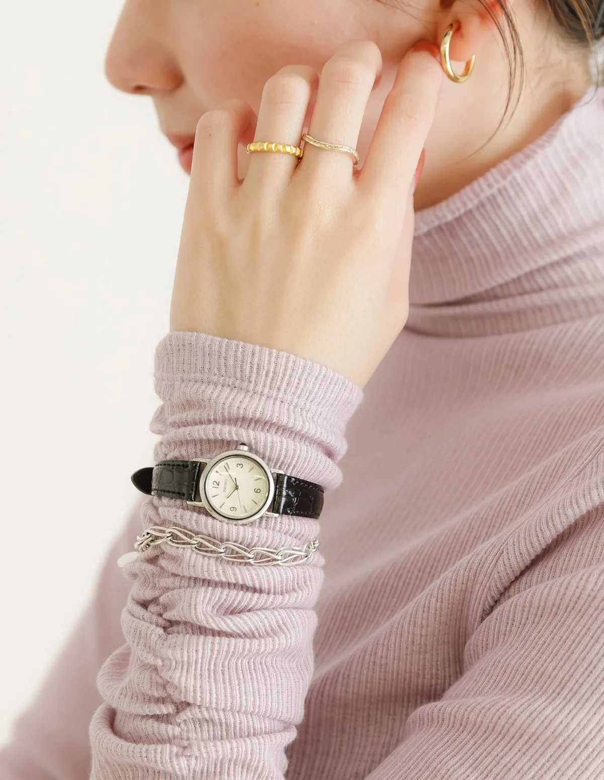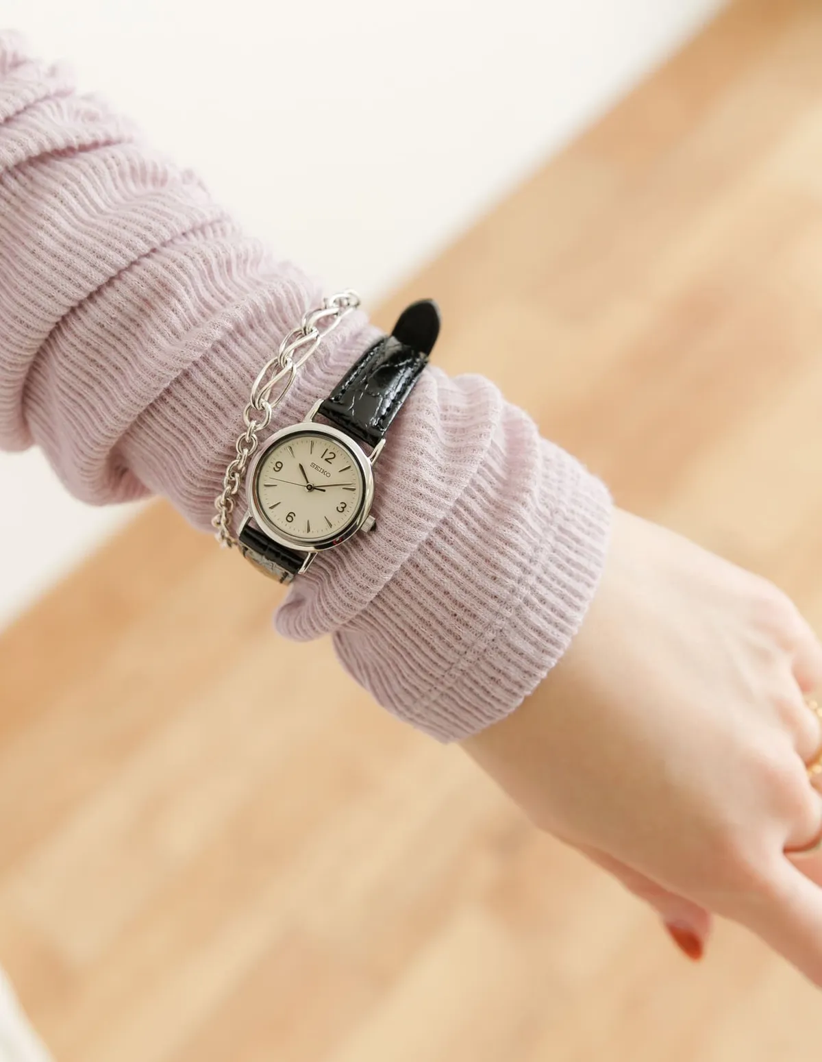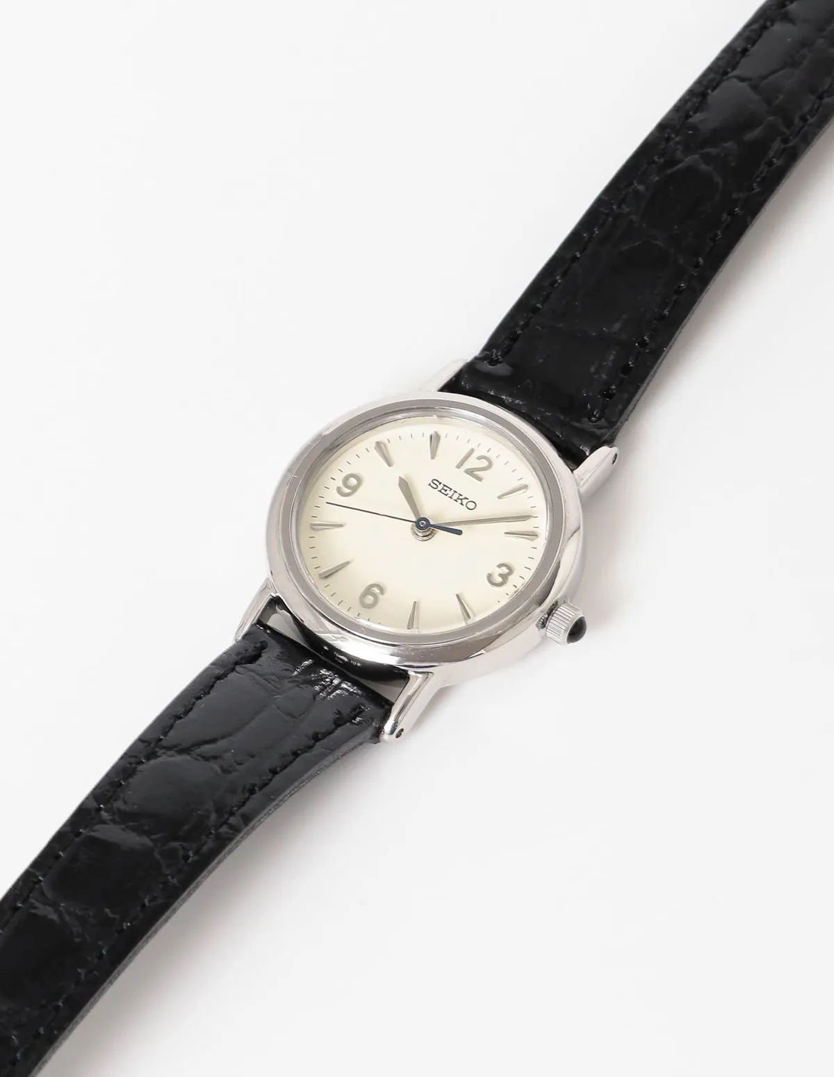 象牙色錶盤搭配立體阿拉伯數字時標,與膚色渾然一體