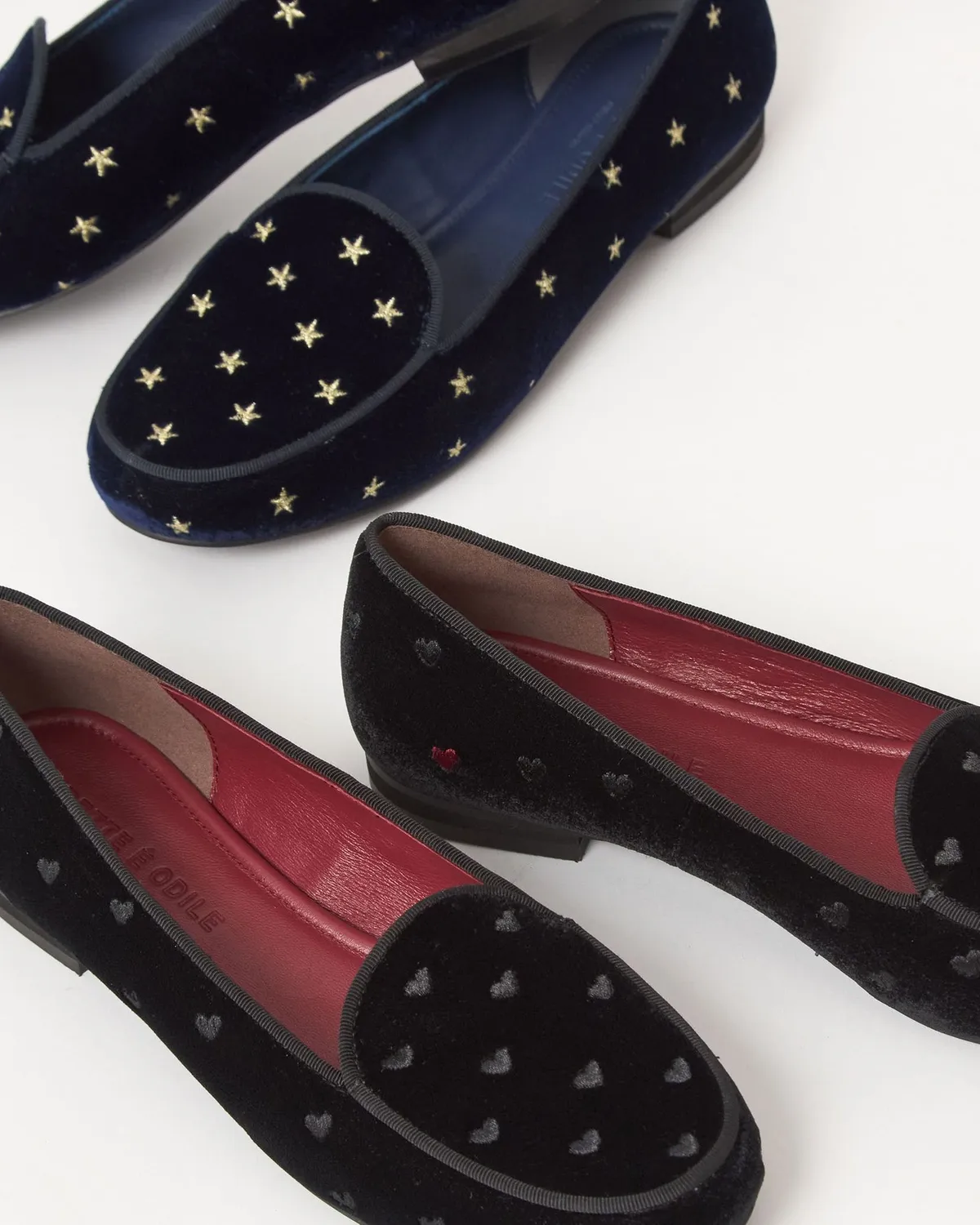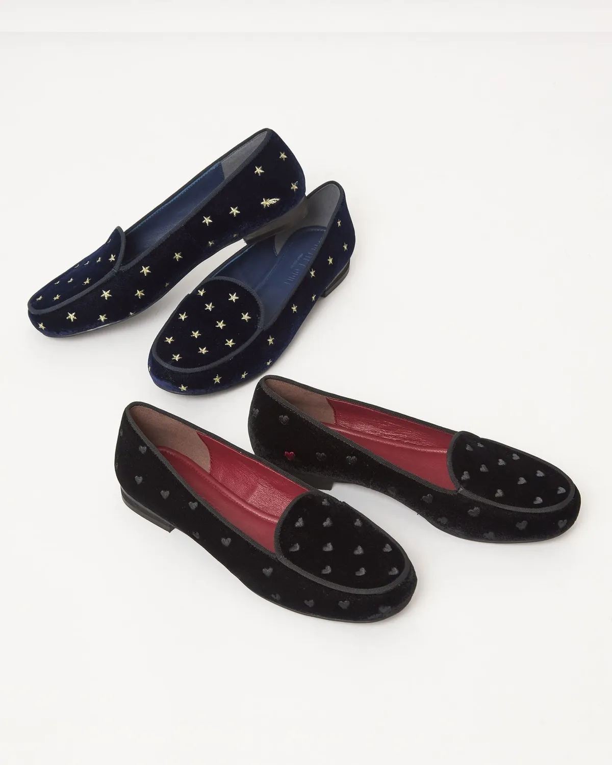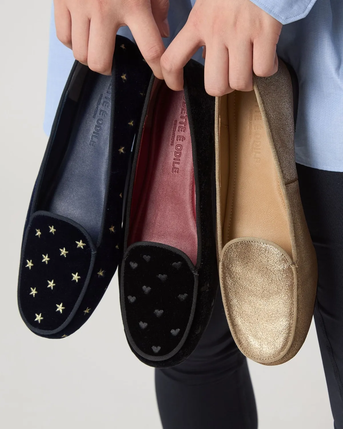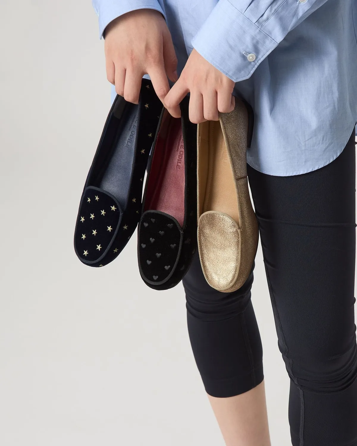 四種不同材質與設計的樂福鞋營造出活潑的設計黑色採用同色系刺繡愛心內側繡有紅色愛心,增添一絲俏皮感海軍藍採用金線刺繡星星內側邊緣繡有一顆流星,增添一絲俏皮感金色和黑色採用簡約飾面百搭適合各種場合材質採用真皮和布料製成黑色和海軍藍採用天鵝絨布料材質金色採用裂痕感、箔狀紋理的皮革材質黑色採用柔軟的褶皺琺瑯皮革材質 此商品為預購商品 到貨時間需等待10~21個工作天 不含假日及國定假日 ⚠️急件處理需自行負擔國際運費