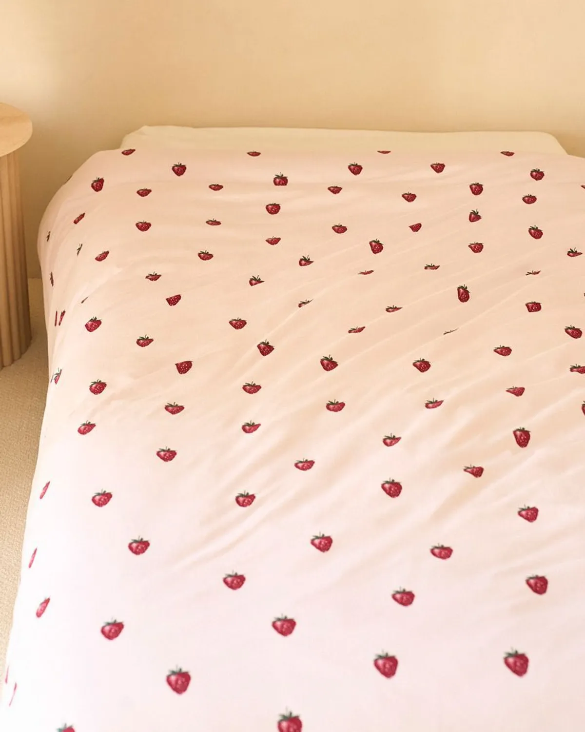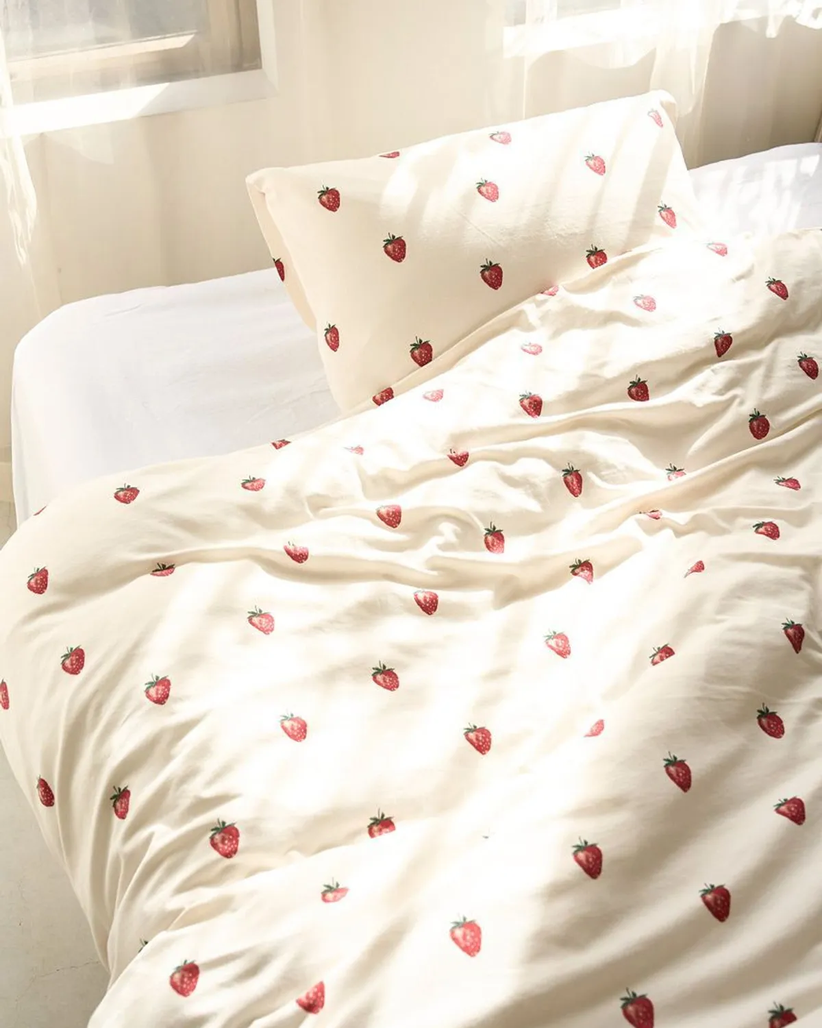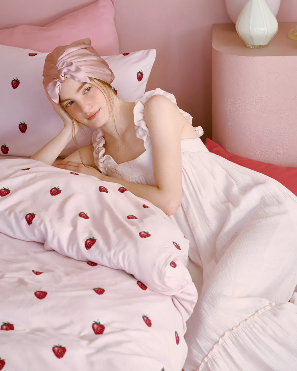 gelato pique 寢具系列最新款!可愛的大草莓圖案這系列使用柔軟光滑的人造絲混棉的布料是任何季節都能舒適使用的寢具共兩色:米色跟粉紅色兩個都有一種成熟又可愛的感覺兩件組內容物包含:棉被套 x 1枕頭套 x 1如果需要兩個枕頭請於官網另外下單枕頭套喔!材質:52%人造絲、48%棉 此商品為預購商品 到貨時間需等待10~21個工作天 不含假日及國定假日 ⚠️急件處理需自行負擔國際運費