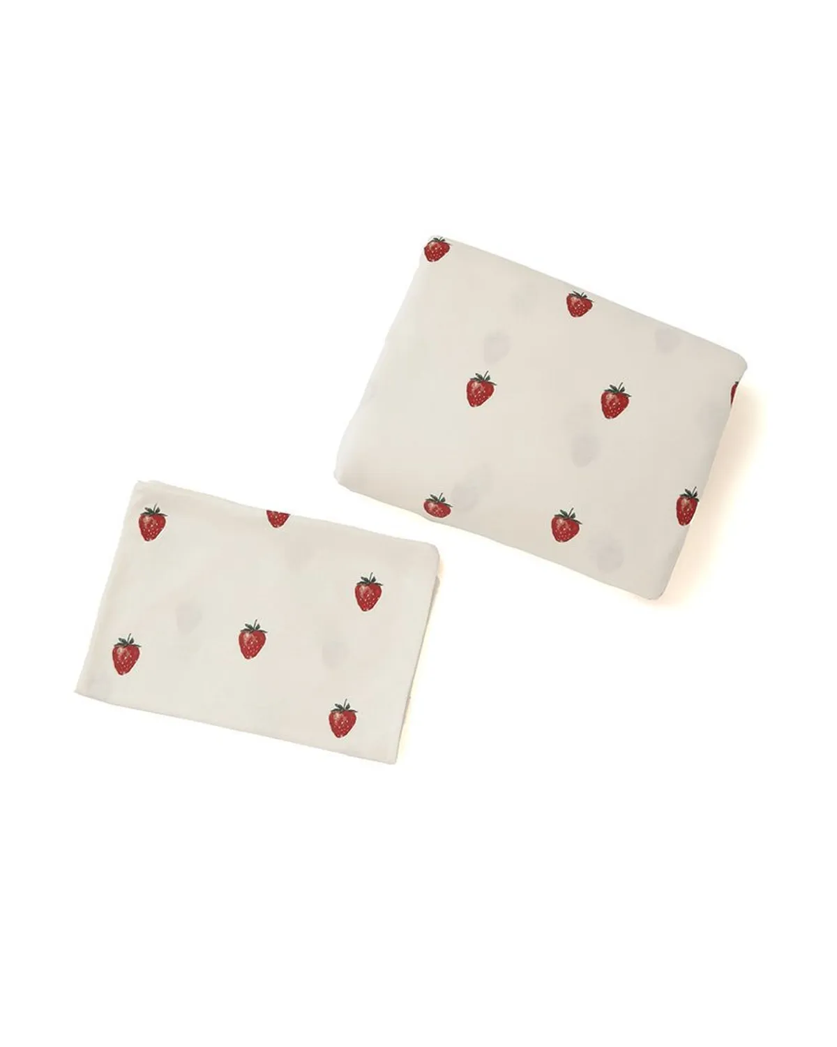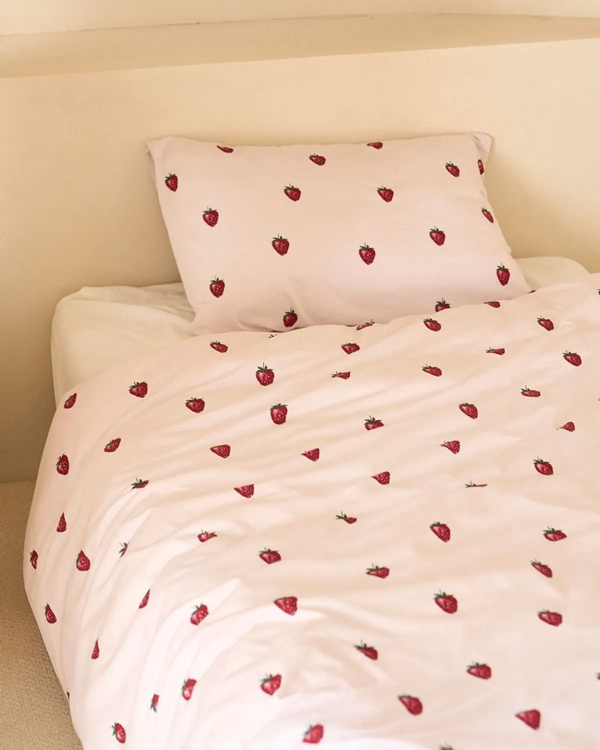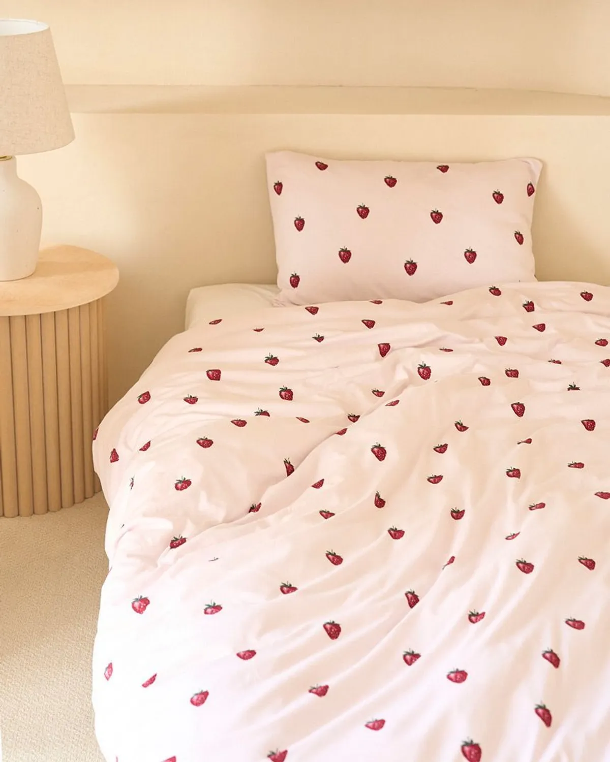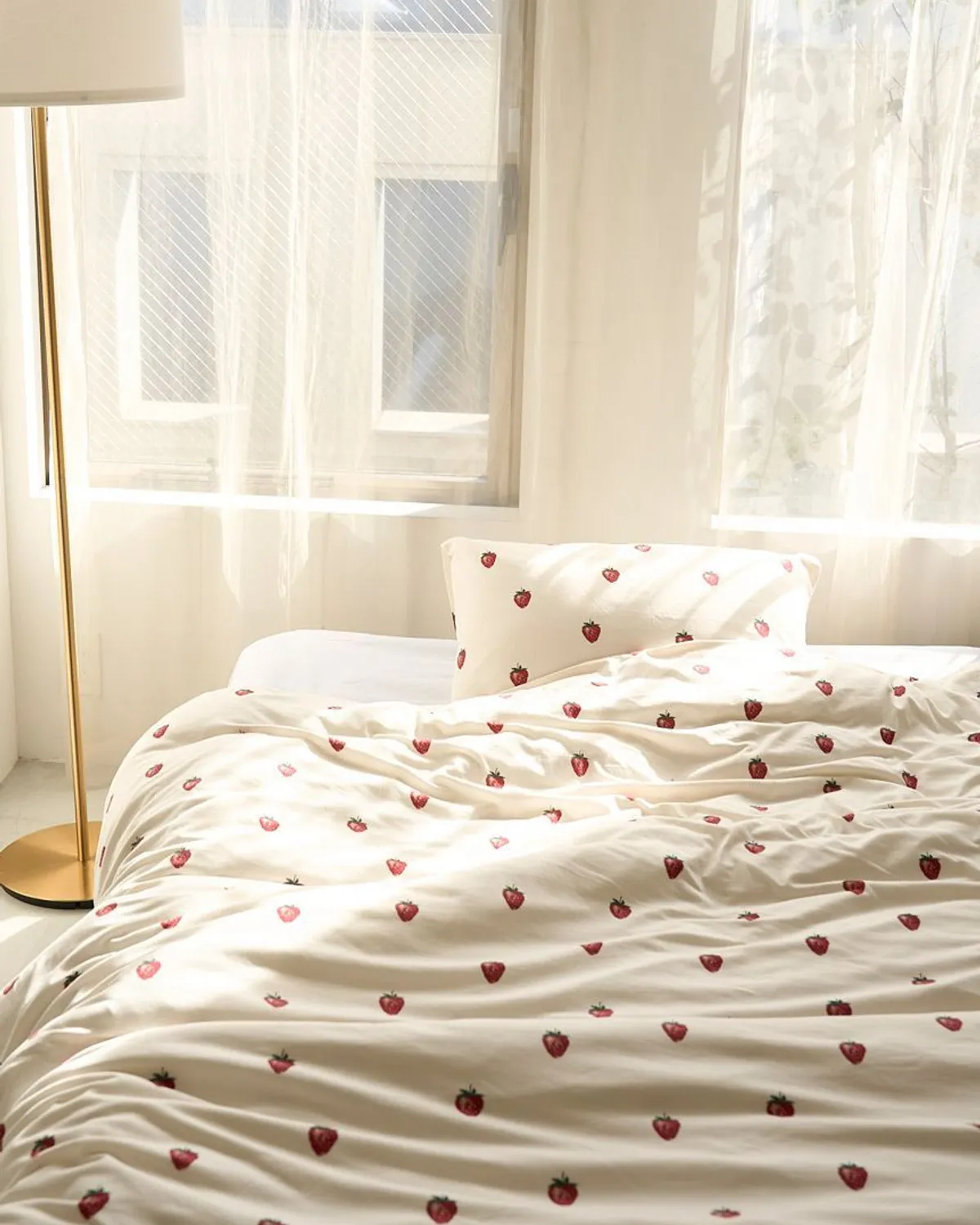 gelato pique 寢具系列最新款!可愛的大草莓圖案這系列使用柔軟光滑的人造絲混棉的布料是任何季節都能舒適使用的寢具共兩色:米色跟粉紅色兩個都有一種成熟又可愛的感覺兩件組內容物包含:棉被套 x 1枕頭套 x 1如果需要兩個枕頭請於官網另外下單枕頭套喔!材質:52%人造絲、48%棉 此商品為預購商品 到貨時間需等待10~21個工作天 不含假日及國定假日 ⚠️急件處理需自行負擔國際運費